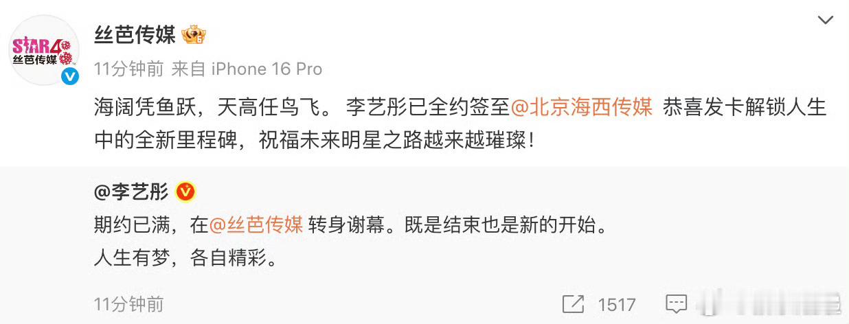 李艺彤和丝芭期约已满 在2025年12月23日零点,李艺彤正式发文,确认与丝芭传媒的合约正常履行至期满后终止,表示“既是结束也是新的开始”。公司同步转发祝福,确认双方系和平解约,未来“海阔凭鱼跃,天高任鸟飞”。李艺彤官宣离开丝芭