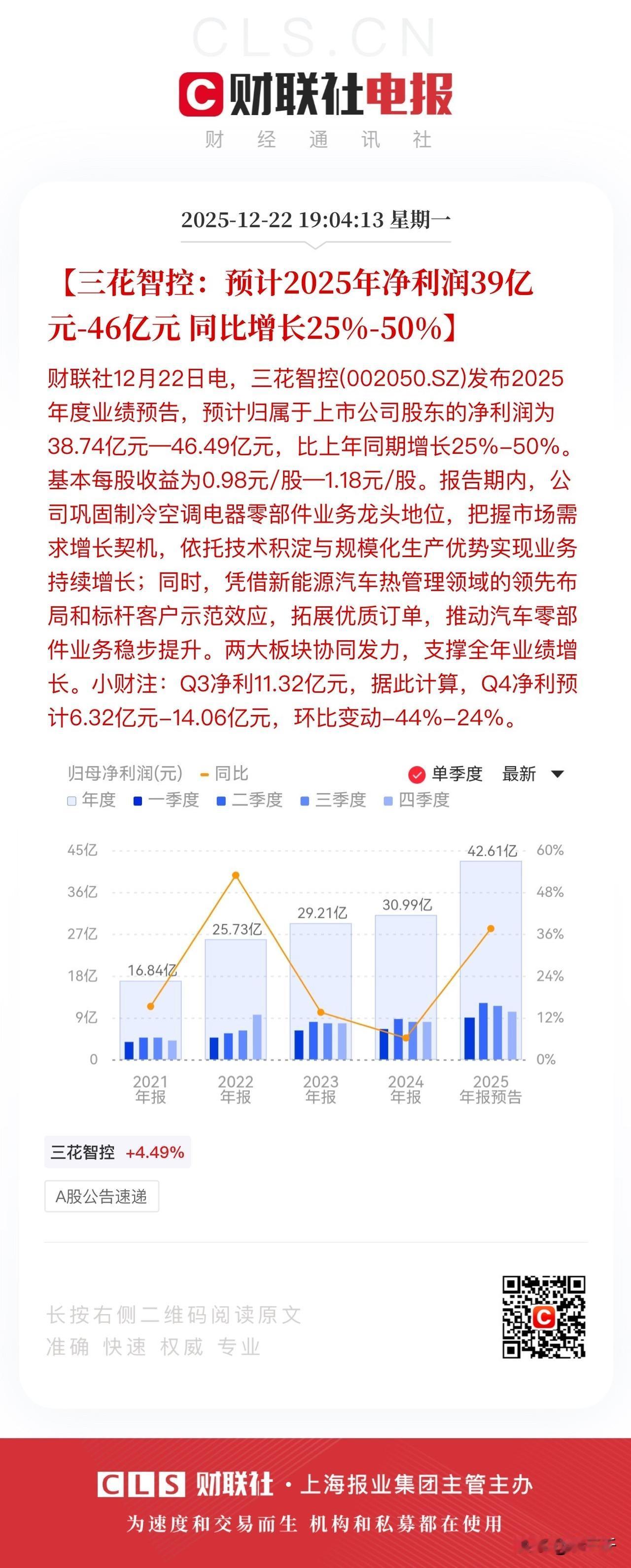 特斯拉机器人龙头股三花智控发布年报预告: 预计2025年归母净利润38.74-46.49亿元, 同比增长25%-50%, Q4净利润中位数10亿元! 三花智控分属家电和汽车零部件板块, 公司掌握核心的热管理技术。 整个新能源汽车核心零部件前三季度业绩都很好,包括:转向和制动系统伯特利、全球雨刮器龙头博俊科技、高股息红利股赛轮轮胎、万向节传动系统拓普集团、智能座舱中科创达以及电子电控系统均胜电子等。 汽车零部件板块相当于鱼塘, 在鱼多的地方捕到鱼的机率大。 三花智控叠加了机器人概念, 是特斯拉核心供应商, 所以这一层光环加持估值逻辑又不一样。 毫无疑问机器人行情后期还是跟特斯拉走, 美股科技巨头的优势在于: 有多个增长级, 有天然的大市场垄断, 所以起点很高。 虽然这一层壁垒在被A股慢慢打破, 但是这个过程绝非一朝一夕! …