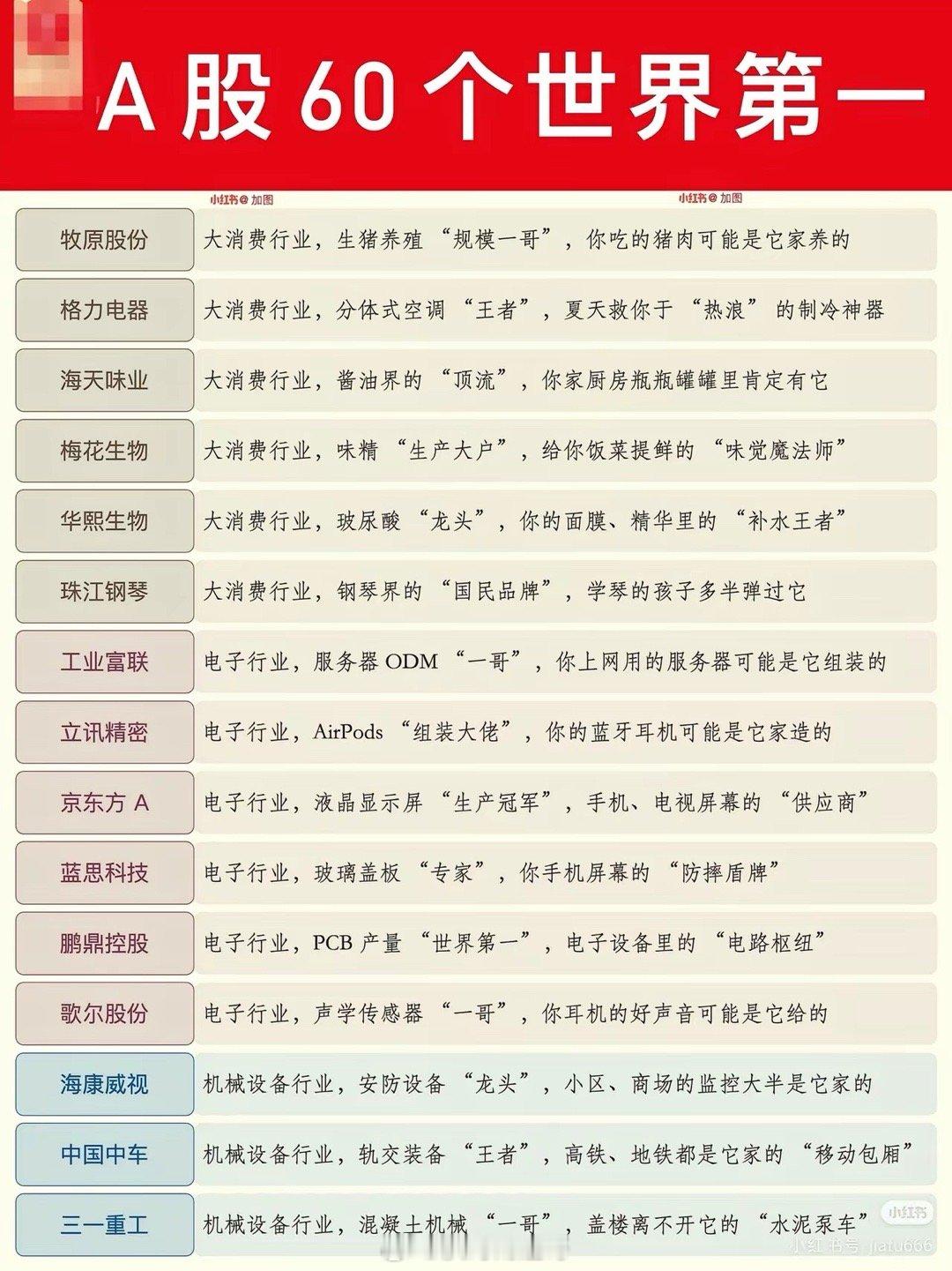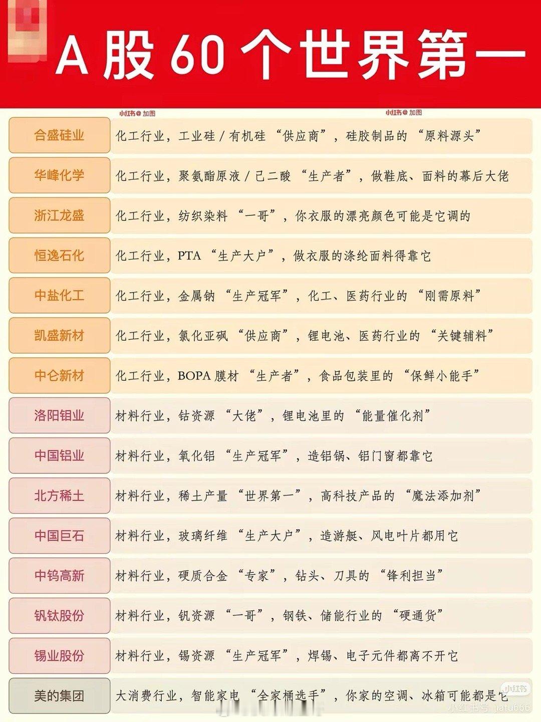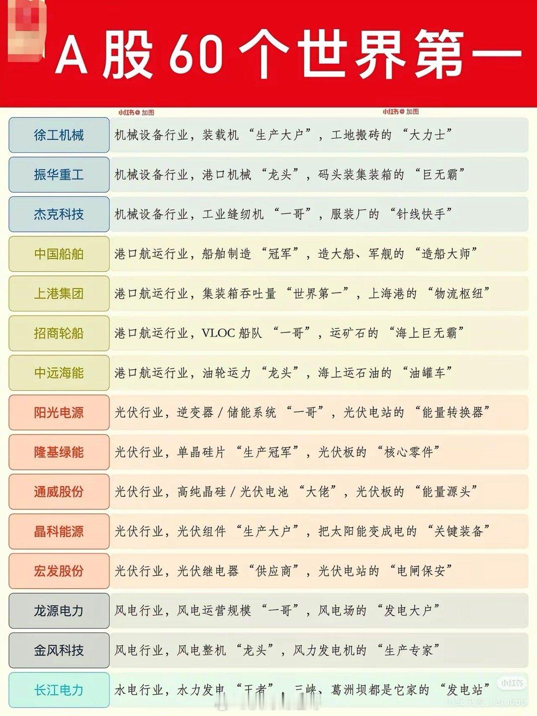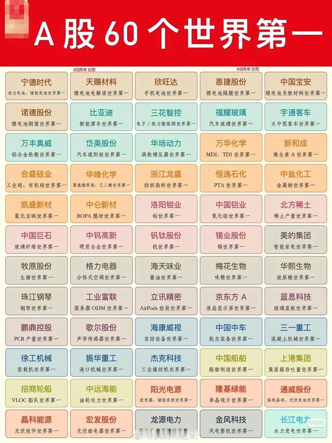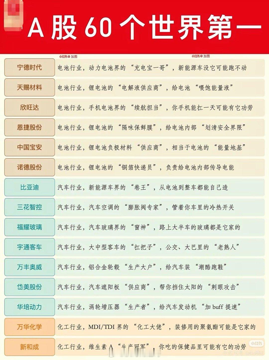 围绕“A股60个世界第一”展开,集中展示A股市场部分企业在全球多领域的领先地位。涉及新能源(动力电池、光伏、风电等)、汽车、化工、家电、电子、机械设备、港口航运、材料、大消费等行业,列举了宁德时代(动力电池/储能电池)、比亚迪(新能源车)、格力电器(分体式空调)、隆基绿能(单晶硅片)等企业,分别标注其“世界第一”的具体领域(如产能、技术、规模等),突出A股企业在全球产业链中的核心优势。