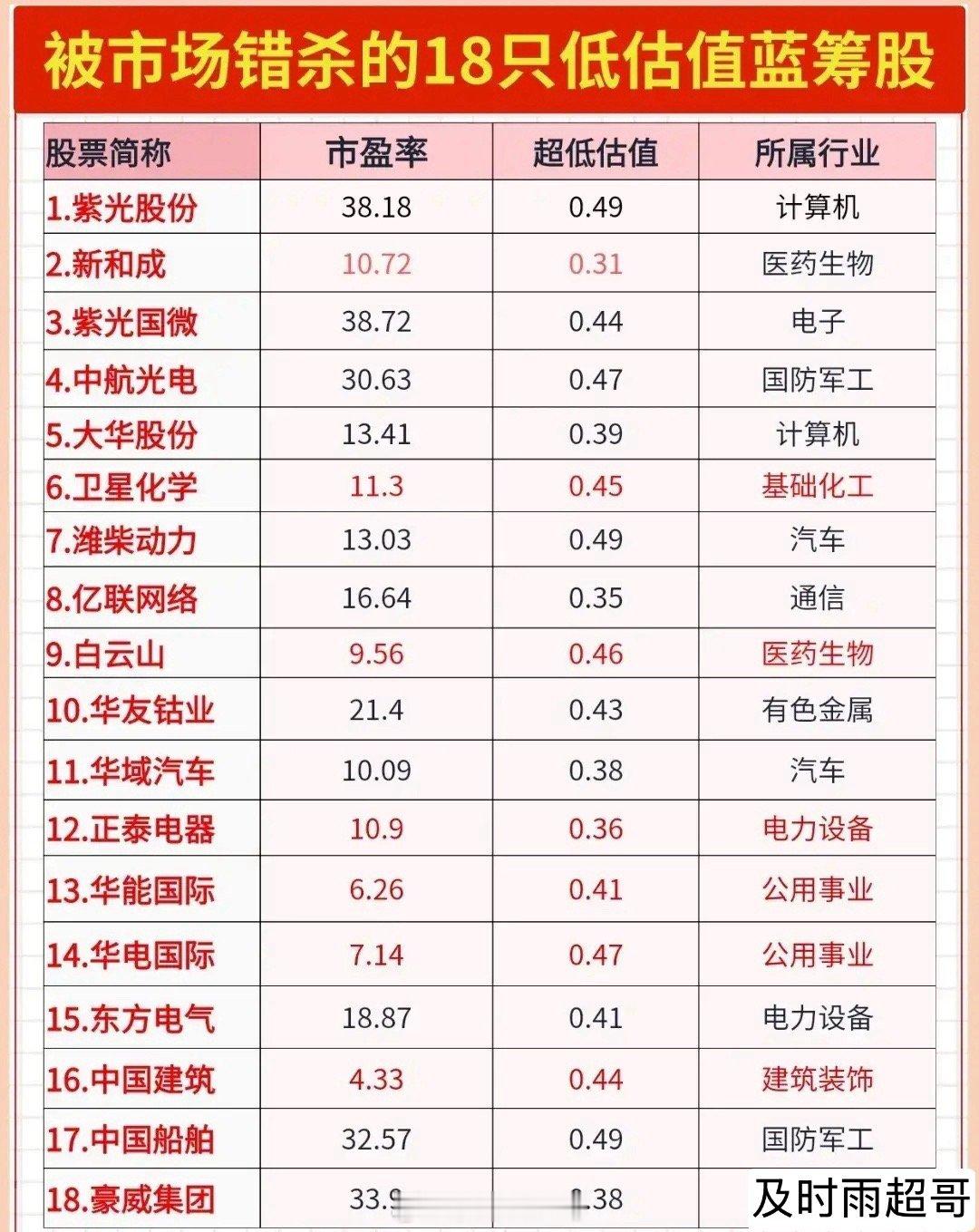 炸裂!被市场错杀的18只低估值蓝筹股曝光,最低市盈率仅4.33,抄底机会来了!挖到宝了!这份名单整理出18只被市场错杀的低估值蓝筹股,涵盖计算机、医药生物、国防军工、电力设备等热门赛道,市盈率从4.33到38.72不等,超低估值数值均低于0.5,估值洼地特征显著。低估值科技蓝筹代表:紫光股份、大华股份、紫光国微、中航光电、中国船舶、亿联网络等等。中航光电国内领先的光电技术解决方案提供商,动态市盈率动才31倍。紫光股份国内领先的IT服务龙头企业,市盈率动才31.3倍。中国船舶国内领先的造船企业,三季度净利润同比增长115.41%,市盈率32倍大华股份全球领先的智慧物联解决方案提供商,市盈率仅13.4倍……~这些错杀蓝筹既能兼顾成长属性,也不乏稳健的蓝筹标的,对于想要布局低估值品种的投资者来说,这份名单值得好好研究!(理财有风险入市需谨慎)
