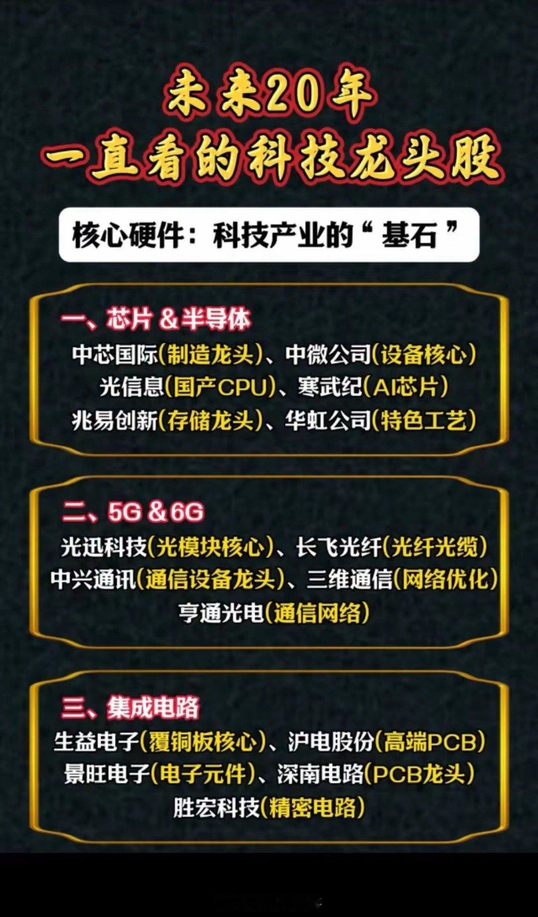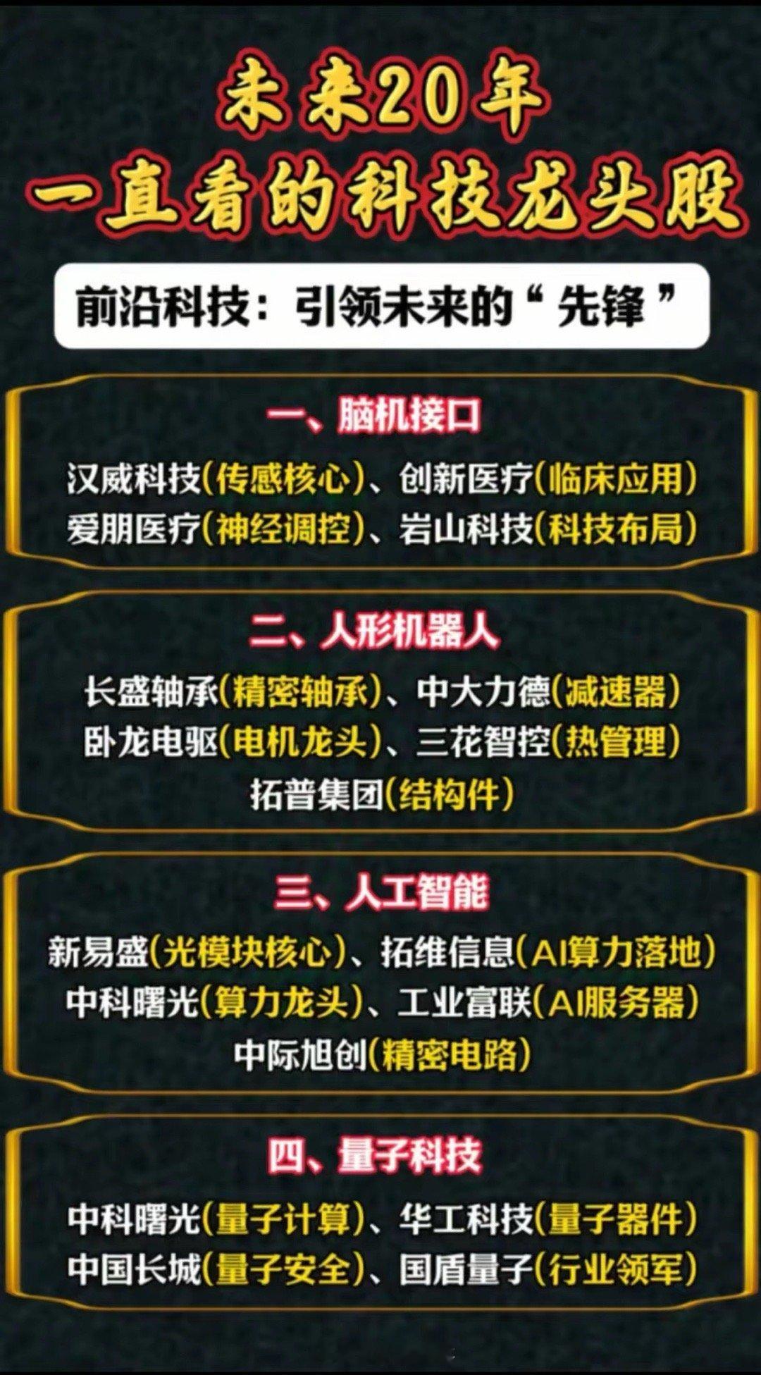 未来20年科技龙头股清单出炉,技术壁垒为何成长期持有的核心逻辑?当脑机接口、人形机器人、量子科技等赛道的龙头股被列为“未来20年长期关注标的”,这份清单不仅勾勒出中国科技产业的发展蓝图,更凸显技术壁垒是科技企业穿越周期的核心底气,叠加政策利好与产业升级的双重驱动,这些龙头企业正成为全球科技竞争的核心参与者。前沿科技赛道的技术壁垒构建起竞争护城河,汉威科技的脑机接口传感技术精度达微米级,成为临床应用的核心支撑;中大力德的人形机器人减速器国产化率超90%,打破海外垄断;国盾量子的量子通信技术实现城域网全覆盖,在量子安全领域占据全球领先地位。这些企业凭借核心技术的不可替代性,在前沿赛道形成独占优势,而人工智能、量子科技等领域的政策补贴加码,进一步放大了技术壁垒的价值。核心硬件与高端制造的技术积淀筑牢产业根基,中芯国际的14nm芯片制造工艺支撑国内半导体自主化,中微公司的刻蚀设备打破海外技术封锁;宁德时代的储能电池能量密度突破300Wh/kg,在全球动力电池市场市占率超35%;迈瑞医疗的医疗设备核心部件国产化率提升至80%,出口至190个国家。这些企业的技术突破,让中国在芯片、储能、医疗设备等核心领域摆脱进口依赖,成为产业升级的核心动力。数字基建与安全防护的技术布局则瞄准未来竞争,中国卫星的商业航天组网技术让低轨卫星制造效率提升40%;用友网络的信创软件适配率达99%,支撑政企数字化转型;奇安信的网络安全技术实现AI威胁检测秒级响应,在关键信息基础设施防护中发挥核心作用。2025年数字经济核心产业增加值占GDP比重超10%,政策红利持续向技术壁垒高的企业倾斜,进一步巩固其龙头地位。中国科技产业的发展已从“规模扩张”转向“技术攻坚”,这些龙头企业的技术壁垒,既是抵御市场竞争的盾牌,也是抢占未来赛道的武器。当脑机接口的临床突破、量子科技的商用落地、半导体的自主化推进形成协同,这些企业不仅是资本市场的长期标的,更是中国科技从“跟跑”到“领跑”的核心力量。