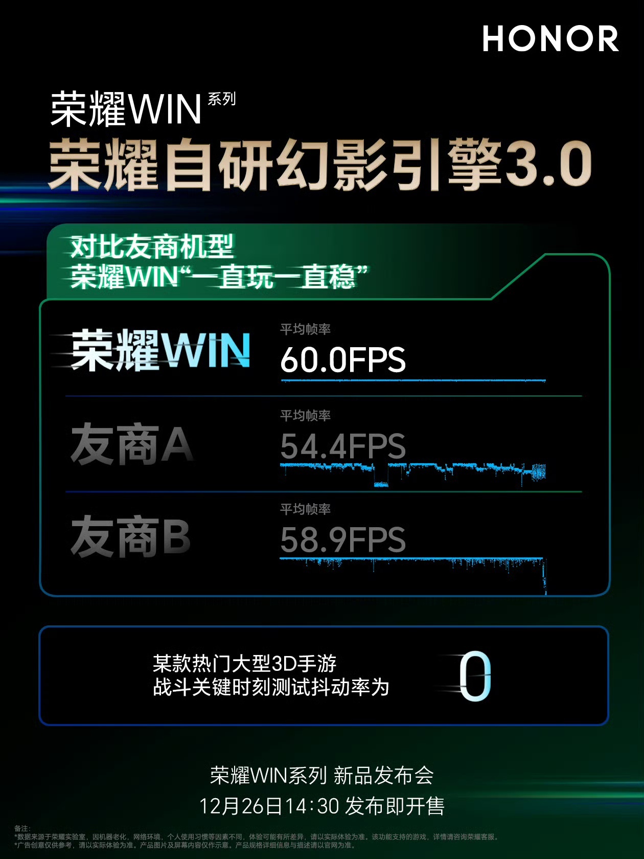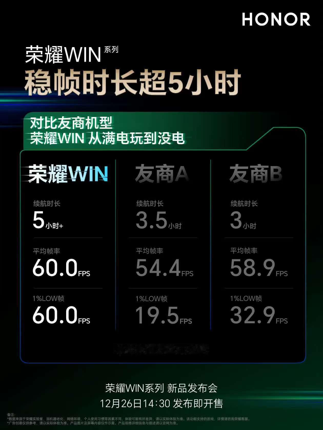 荣耀WIN第五代骁龙8至尊版和10000毫安电池真绝配,再加上荣耀自研幻影引擎3.0,稳帧运行时间最长,续航时间最长。