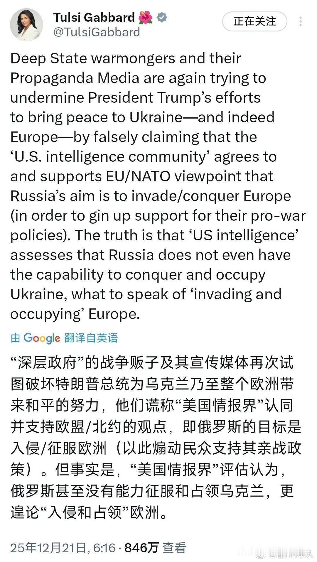 12月21日美国国家情报总监图尔西・加巴德写道:"深层政府"的战争贩子及其宣传媒体再次试图破坏特朗普总统为乌克兰乃至整个欧洲带来和平的努力,他们谎称"美国情报界"认同并支持欧盟/北约的观点,即俄罗斯的目标是入侵/征服欧洲(以此煽动民众支持其亲战政策)。但事实是,"美国情报界"评估认为,俄罗斯甚至没有能力征服和占领乌克兰,更遑论"入侵和占领"欧洲。 美国国家情报总监图尔西・加巴德言论核心围绕两个关键指控:一是“深层政府”势力试图破坏特朗普推动的俄乌和平进程;二是美国情报界实际评估认为俄罗斯无能力征服乌克兰或欧洲,反驳了“俄罗斯计划入侵欧洲”的说法。 加巴德确实公开指责过“深层政府”阻挠和平努力,她在社交平台明确表示:美国情报界评估认为俄罗斯“试图避免与北约爆发更大规模战争”,且俄军战场表现证明其缺乏占领乌克兰全境的能力,更遑论入侵欧洲。俄罗斯总统特别代表德米特里耶夫随后感谢加巴德揭露“深层政府煽动俄欧冲突的企图”。 就在加巴德发表此言论之前一天,路透社2025年12月20日援引6名美国情报界消息人士称,普京的目标仍是“占领乌克兰全境并恢复对前苏联欧洲领土的影响”。这与加巴德的表述矛盾,加巴德的最新言论,可能是对路透社的一种回应。 加巴德作为特朗普任命的情报总监,其表态可能反映白宫立场; 情报界内部存在不同派别,部分人士坚持对俄强硬评估,而加巴德认为此类评估被“武器化”以煽动战争。 被特朗普提名情报总监之时,就有舆论称加巴德亲俄。