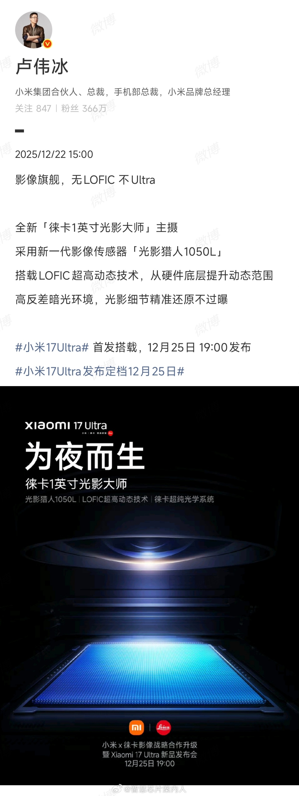 LOFIC技术通过硬件层面的创新实现单帧高动态范围成像,解决了传统多帧HDR技术的鬼影、运动模糊问题,动态范围可达140dB+(约15EV),优于传统技术的100-120dB,同时大幅降低处理延迟和功耗,使手机在逆光、夜景等极端场景下能同时保留高光与暗部细节。小米17ultra发布定档12月25日