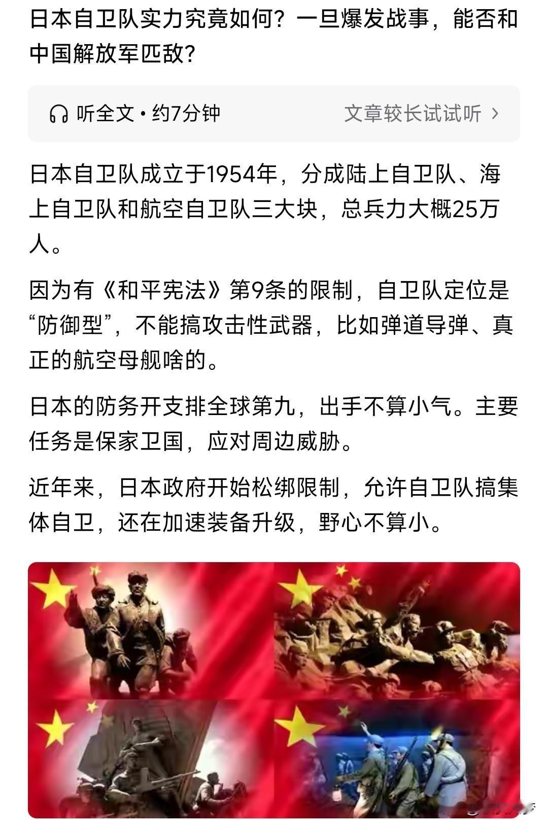 日本自卫队的实力实际上是被国内某些自媒体严重夸大的。 1:社会处境尴尬 日本自卫队并不是严格意义上的军队,左右翼都对其不感冒。这导致他们社会地位低下堪比宋代贼佩军。 2:待遇低下 表面上看日本军费总量非常高,但是日本军费使用率极差,钱的大头实际上被几家大财团瓜分。普通士兵的收入是1950年代标准,虽然近几年有所提高但是还是15万日元月薪,而日本社会平均工资达到32万日元。大头兵还不如便利店职员收入一半高,这导致年轻人普遍参军热情低。 3:兵将分离战争观念落后 日本首相创造过十年九相的奇迹,而日本自卫队高级军官缺基本上一两年轮调。这导致兵不知将将不识兵,长官无心部队训练,很多训练科目还停留在二战水平。例如日本自卫队至今还有用木棍打黑熊的训练科目。