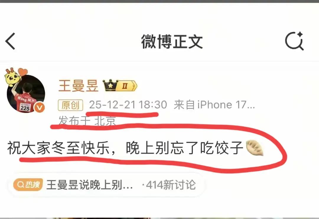 【王曼昱冬至发微博,就一句话问候】王曼昱很宅,发个微博,就一句话,连个照片也没有。就说祝大家冬至快乐,晚上别忘了吃饺子。大家还没看过瘾呢。 全红婵还知道经常发几个图片啥的,滑雪、喝奶茶、听音乐、搞采摘之类的。让大家知道她在哪里,在做什么,和谁在一起,心情怎么样。陈芋汐去了意大利,主动发倒立一字马,也是如诗如画。 这个王曼昱很低调,不爱说话。有时看她的报道,也就跟陈熠、徐奕这些好友小妹妹在一块,有说有笑,甚至打打闹闹。 看来王曼昱就知道捐钱了,也不怎么展示自己。你要说她文化水平不足,似乎也不是,面对记者现场采访,汗还没擦干净,说话一板一眼,没什么漏洞,不像蒯曼爱笑,看上去有点露怯。比如球迷一边倒喊孙颖莎,她也只是提示保护嗓子。 情绪控制得很好,点到为止,脑子是有的。看来平时心思都放在学习上了。王曼昱教育经历以中专、本科、即将清华读研为主线,走的是体育训练与文化课学习相兼顾的路子。 王曼昱早年在黑龙江接受基础教育,同步进行乒乓球训练,就读于体育相关中专,这是运动员的常规培养路径。 专注于乒乓球训练,采用体教结合模式完成中专阶段学业,为后续深造打下了坚实的基础。 本科阶段就读于上海交通大学,2019年入学安泰经济与管理学院人力资源管理专业。上的是冠军班,弹性学制6-8年,采用网课、集中授课等方式,兼顾训练与比赛,2025年6月顺利本科毕业。本科期间修满学分,毕业论文获优秀,综合表现优异。 2025年9月公示,10月30日获清华大学社会科学学院免试攻读研究生拟录取资格,专业也是体育相关方向。据说综合考核成绩89.44分,计划2026年9月入学,开启硕士阶段深造。 冬日生活打卡季