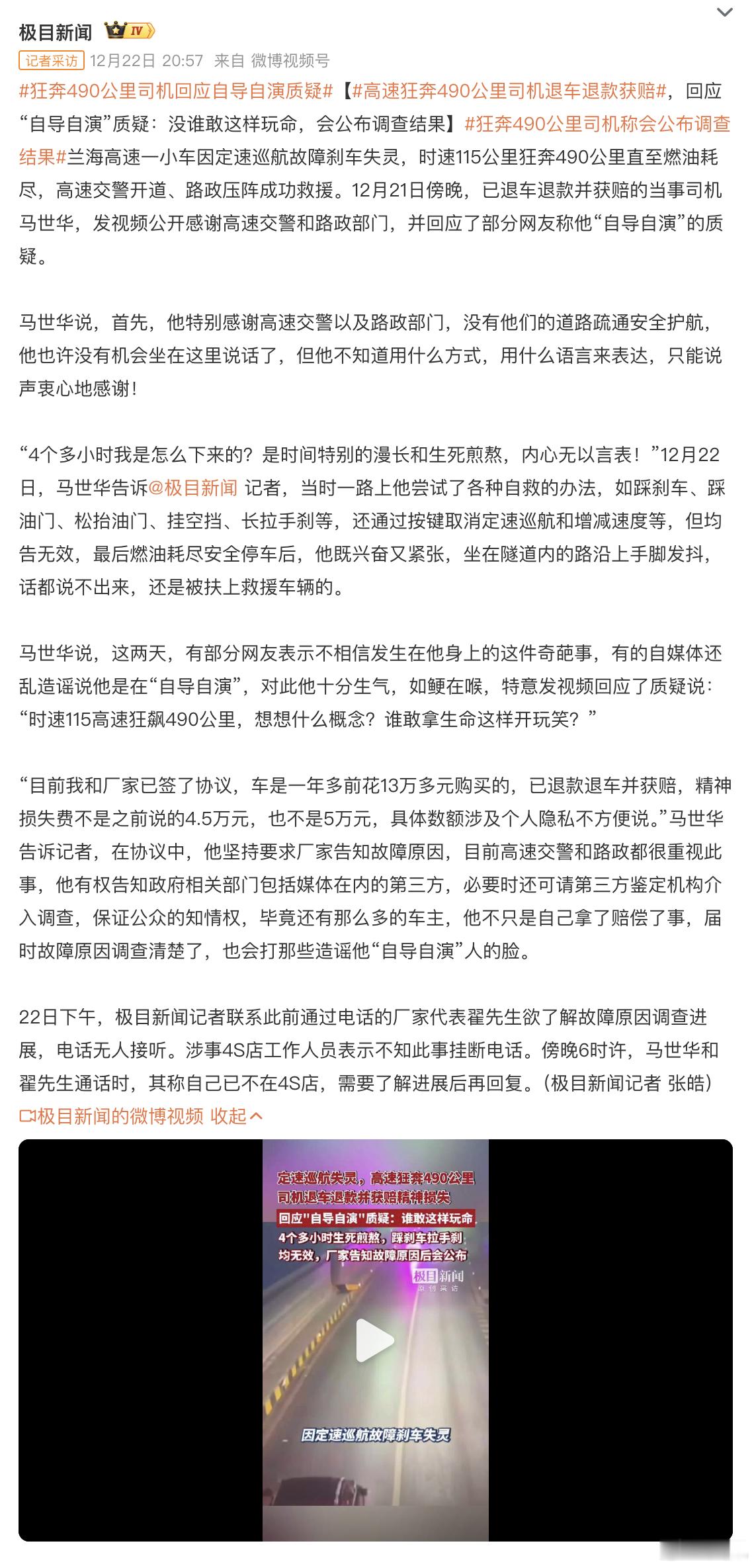 高速狂奔490公里司机退车退款获赔已告一段落,厂家已经退款退车,而小马说要打脸说他“自导自演”的人。用性命攸关的经历挑战了很多工程师的认知,暂时看,他赢了?狂奔490公里司机回应自导自演质疑狂奔490公里司机称会公布调查结果