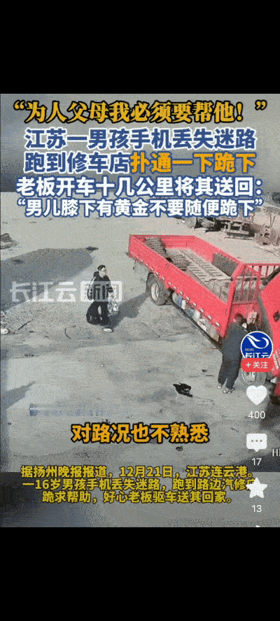 “活该这老板发财!”江苏连云港,一男孩提着书包,跑到一家修车店,突然就跪了下来,本以为是碰到讨钱的了,问明缘由后,老板亲自开车,把孩子安全送回了家。网友:下跪是对老板帮助他的最高礼仪的感谢! 修车店的侍先生正忙着,一个学生模样的男孩走进来,扑通一声就跪下了。侍先生吓了一跳,心想:这孩子是怎么了?一问才知道,男孩是附近学校的学生,因为对周围路况不熟,手机丢了身上也没带钱,迷路了。孩子急得眼泪在眼眶里打转,他说不清家具体在哪,只记得大概方向。你说说,这大晚上的,一个孩子在外面多危险。 侍先生没多想,放下手里的活,招呼孩子上车。“走,我送你回去!”他开着自家那辆小车,按照男孩指的方向,一个村一个村地找。孩子家长正急得团团转,看到孩子从陌生人的车上下来,激动得说不出话。他们拉着侍先生要感谢,侍老板摆摆手,调头就回店里了。 这事被人发到网上,一下就传开了,侍先生挺不好意思的:“这有啥好说的?谁家没个孩子?看见了能不管吗?孩子那一跪,我心里更不是滋味了。”这一送,耽误了生意,还搭上油钱。可侍先生觉得值当。“赚钱日子长着呢,帮孩子一把可是眼前要紧的事。” 现在人和人之间防备心重,看到孩子跪下的第一反应可能是“碰瓷”。但侍先生选择了相信,选择了伸手。孩子用最传统的下跪表达无助与感谢,大人用最朴实的行动接住了这份信任。一来一去,没那么多大道理,就是人心换人心。修车老板的举手之劳,对孩子来说就是天大的事。这份善意会在孩子心里种下一颗种子,将来他也会愿意帮助别人。 这不就是咱们常说的“好人有好报”吗?为啥网友都说“活该他发财”?因为大家从心底里敬重这样实在、热心的人。这种人格信誉,比什么广告都强。 各位读者你们怎么看?欢迎在评论区讨论。