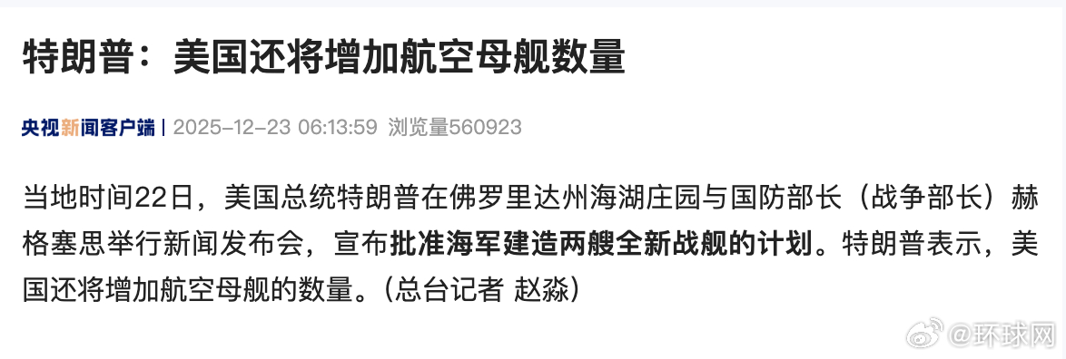#特朗普宣布美将增加航母数量#【特朗普:美国还将增加航空母舰数量】当地时间22日,美国总统特朗普在佛罗里达州海湖庄园与国防部长(战争部长)赫格塞思举行新闻发布会,宣布批准海军建造两艘全新战舰的计划。特朗普表示,美国还将增加航空母舰的数量。(央视新闻客户端)