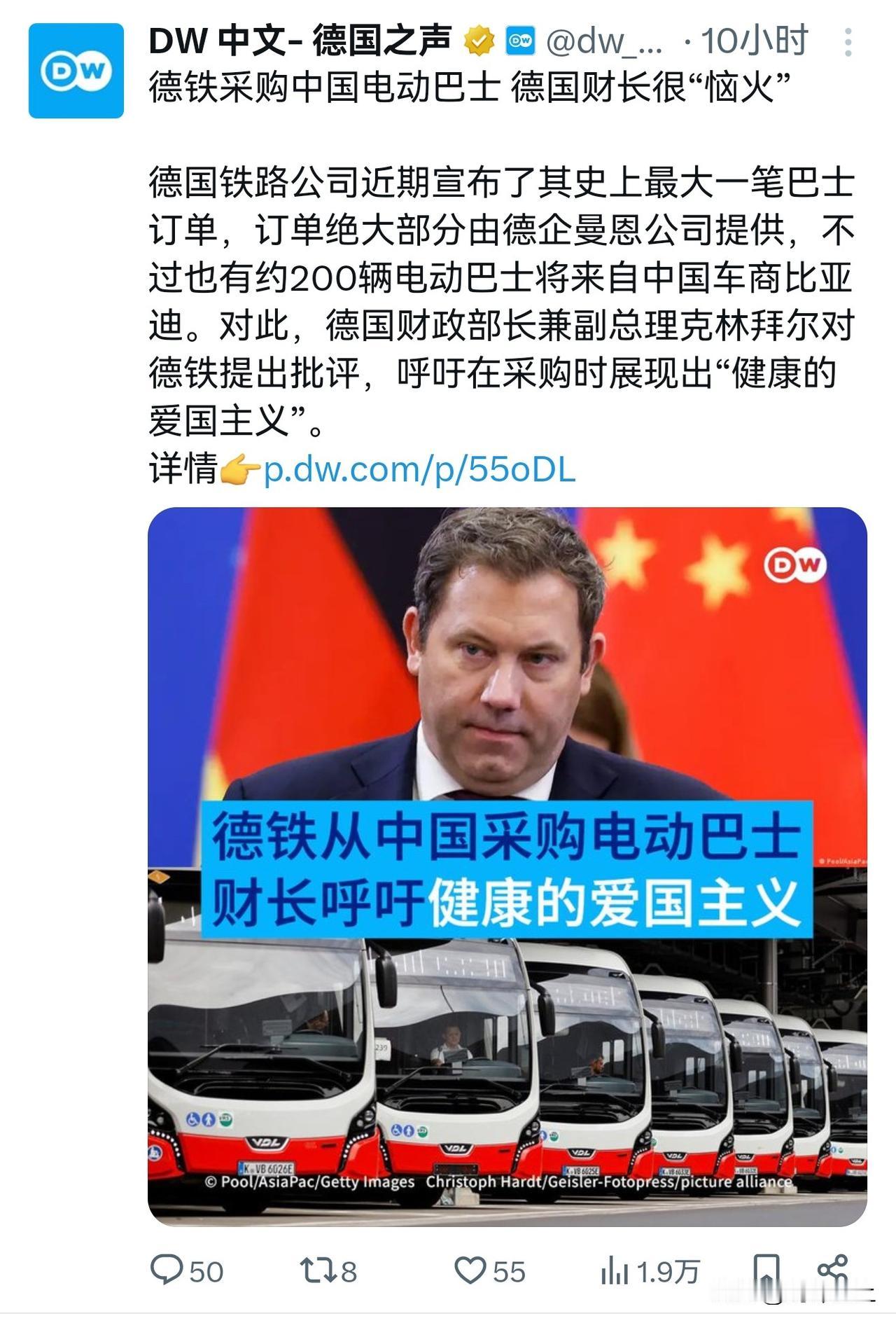 打不赢就喊爱国 德国铁路公司采购了200辆比亚迪电动巴士 德国财长气炸了,表示企业采购时要发扬爱国主义精神 技术比不过,质量比不过,价格比不过,现在就开始用爱国主义绑架企业了