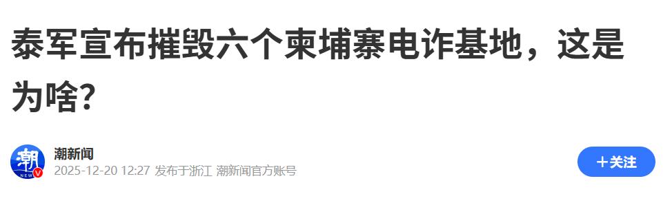 泰国这次不玩虚的了!2025年12月18日,泰国军方重磅宣布,摧毁六处柬埔寨诈骗基地!而后转身,给我国“投名状”! 近期泰国同柬埔寨的新一轮军事冲突,成为了国际关注的焦点。在这一轮的军事冲突中,泰国下定了决心,对柬埔寨进行了大力的进攻。在冲突爆发的过程中,泰国针对柬埔寨的电炸基地,进行了猛烈的袭击。 根据泰国军方在2025年12月18日的宣布,可知在短短数日的时间,泰国方面就摧毁了六处柬埔寨的电炸基地。其中包括因电诈美国公民,而被美国制裁的度假村和赌场酒店等。 泰国摧毁柬埔寨定炸基地这一举动,在国际上获得了国际公民的高度认可。对于电诈,国际公民普遍的痛恨。所以泰国的这一举动,简直就是大快人心!而就在摧毁柬埔寨电诈基地的同时,泰国向我国“投名状”! 就在2025年12月18日的时候,我国驻泰国大使就会见了泰国总检察长。在举行会见的过程中,泰国总检察长就表示,愿意学习借鉴我国依法治国的经验。并强调会密切交流合作,与人员往来,以此加快推动重点引渡案件,共同打击电诈等跨国犯罪。 泰国的这一举动引起了国际的高度讨论,在大力打击柬埔寨电诈基地的前提下,向我国做出这番表态。很难不让人怀疑,泰国一开始去摧毁柬埔寨电诈基地,目的就不单纯! 对此,您怎么看?欢迎评论区留言您的看法,我们一起讨论一下。 (信息来源:泰国总检察长:愿学习借鉴中方依法治国经验-观察者网) (信息来源:泰军宣布摧毁六个柬埔寨电诈基地,这是为啥?-潮新闻)
