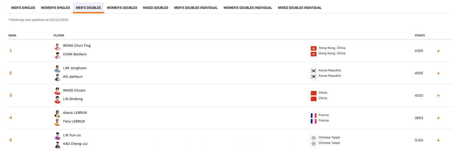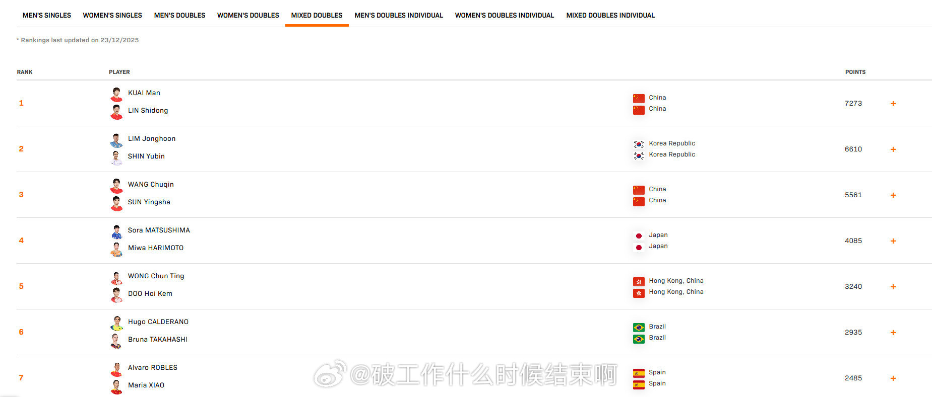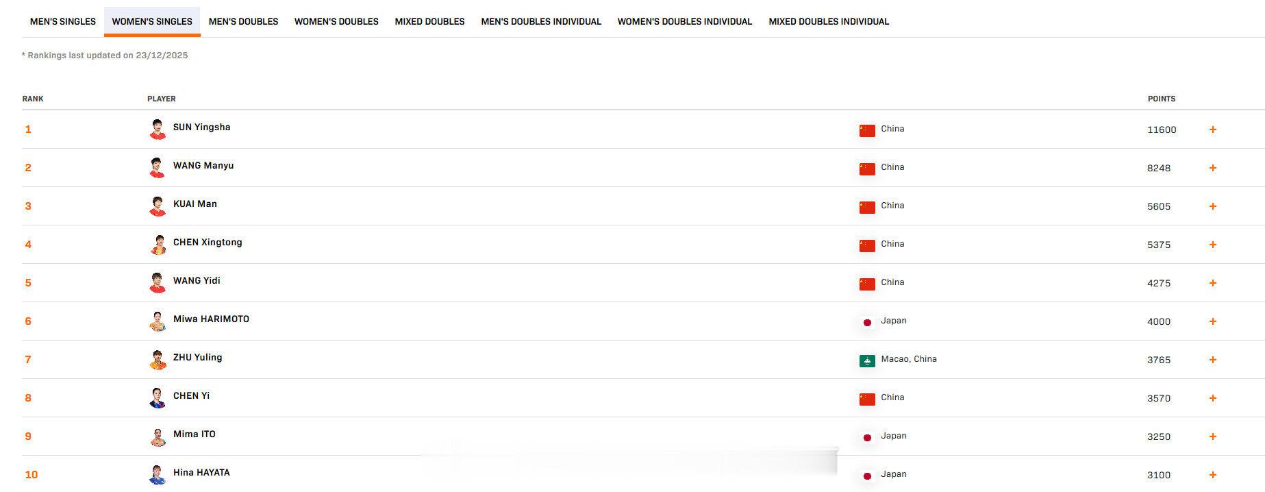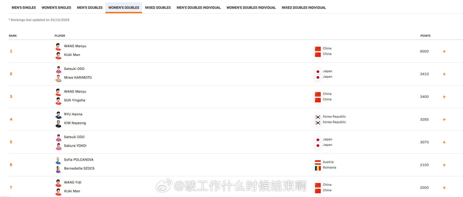 📢2025国际乒联第52周排名📍【2025国际乒联第52周排名】🏓男单:王楚钦、林诗栋位列前二,梁靖崑位列第7,向鹏第11🏓女单:孙颖莎11600分、王曼昱、蒯曼、陈幸同、王艺迪前五,陈熠第8🏓男双:王楚钦/林诗栋第3、林诗栋/黄友政第9🏓女双:王曼昱/蒯曼第一、孙颖莎/王曼昱第3、蒯曼/王艺迪第7、孙颖莎/王艺迪第10🏓混双:林诗栋/蒯曼第1、王楚钦/孙颖莎第3、黄友政/陈熠第11孙颖莎连续180周女单第一