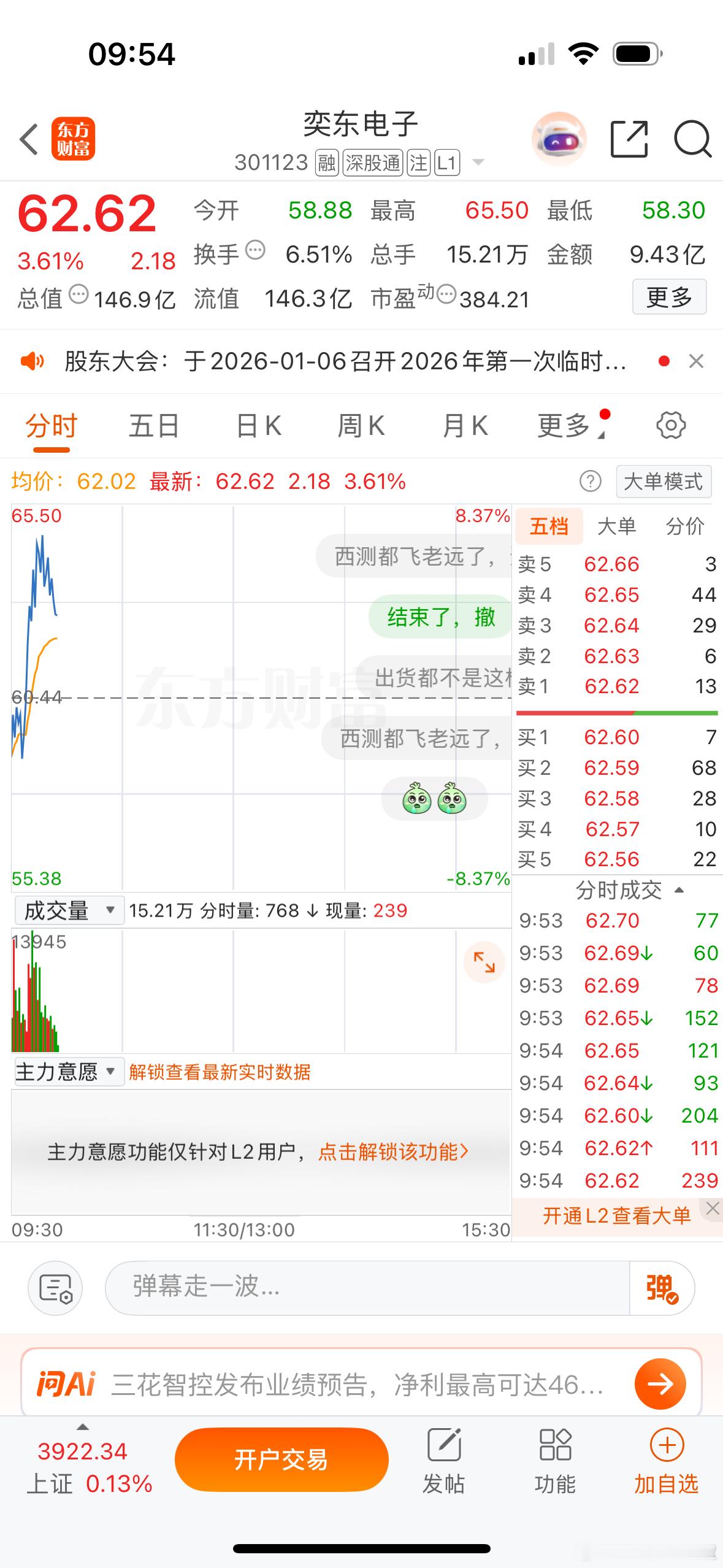 芳华50万短线账户18号入的$奕东电子sz301123$,早盘冲高也接近15