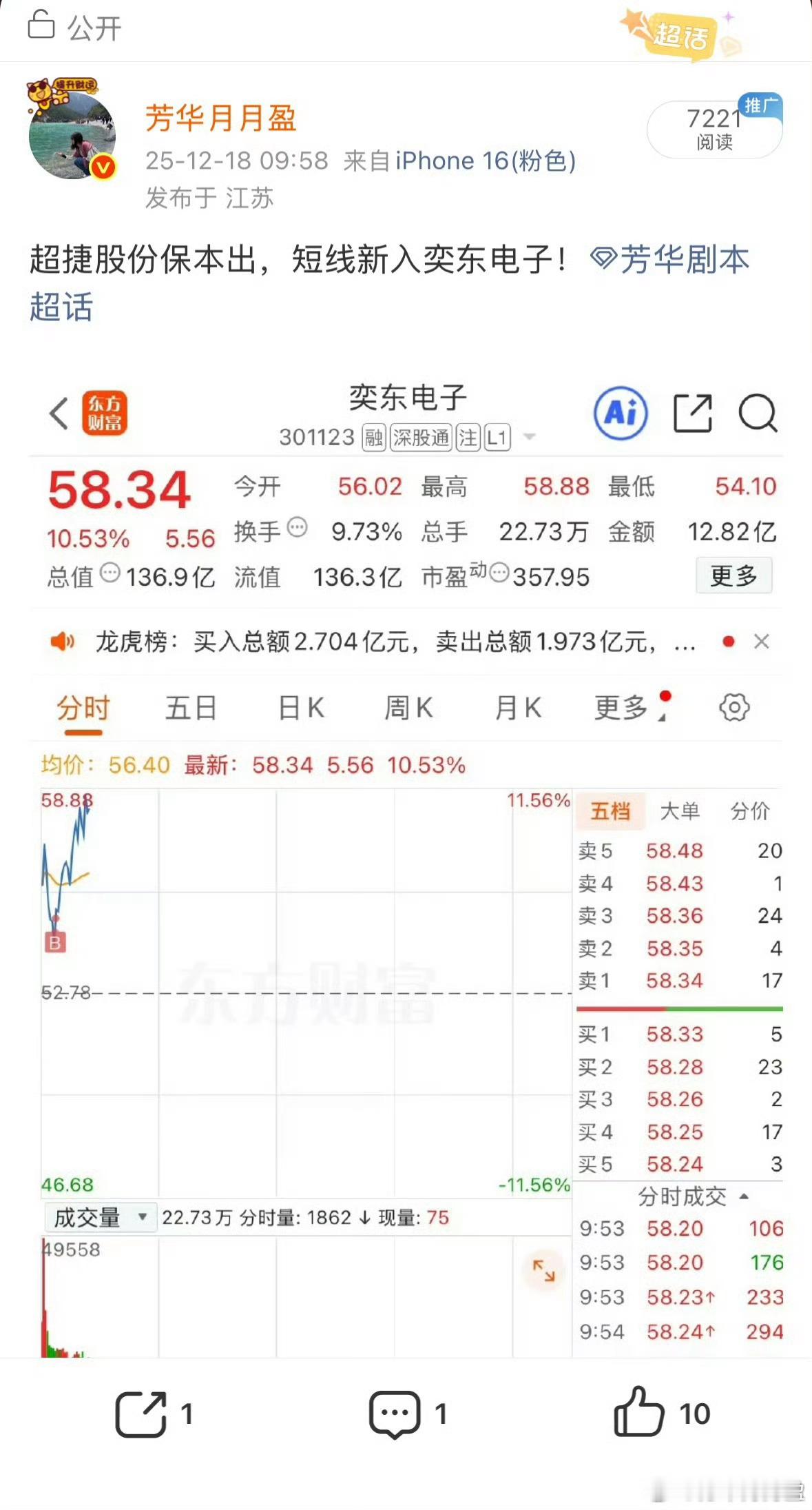 芳华50万短线账户18号入的$奕东电子 sz301123$ ,早盘冲高也接近15个点利润!芳华剧本