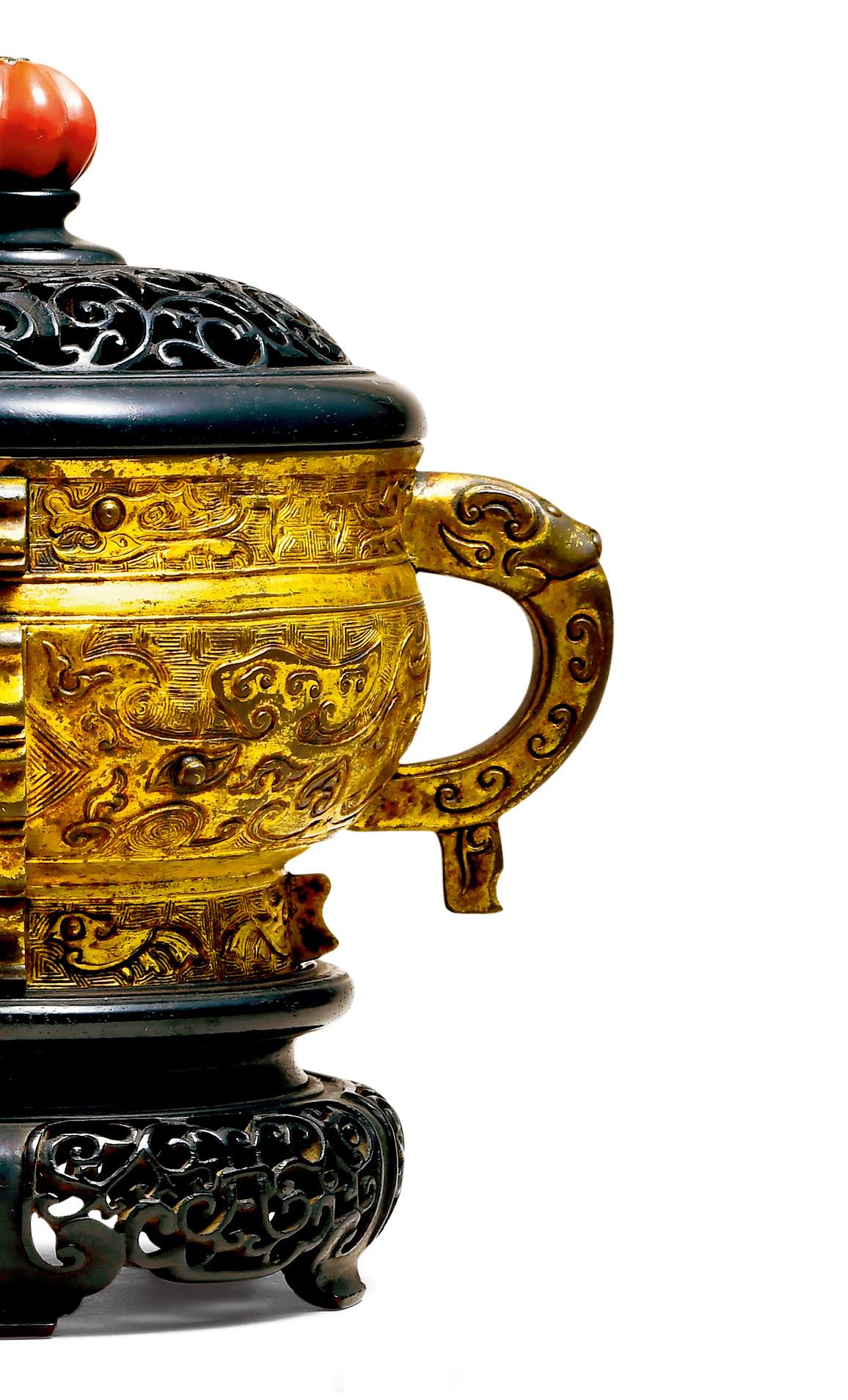 明 铜鎏金饕餮纹簋式炉此炉造型仿商周青铜器簋,通体鎏金而成。炉为盘口,束颈,圆腹,高圈足,双肩附夔龙形双耳,龙尾成耳垂,造型轩昂沉稳。颈部和圈足分别装饰夔龙纹和凤鸟纹,炉身以兽面纹为主题,正中对称分布出脊,辅以云雷纹、夔龙纹、勾云纹和几何纹,布局繁而不乱,大气规整。夔龙、神兽、凤鸟的细节及辅纹细如毫发,舒卷流畅,足见铸造工艺之精良。原配木制炉盖及底座,皆镂空雕刻缠枝纹,炉盖上镶嵌南红玛瑙瓜棱珠。整器金水浓厚,富贵之气与暗黑色木盖座的深沉肃穆相得益彰,于朴实之中显华丽,带有浓郁的宫廷造办处风格。重:848.5g尺寸:口径12cm;炉高7.5cm来源:中贸圣佳2025秋季三十周年庆典拍卖会《集萃——古董珍玩专场》