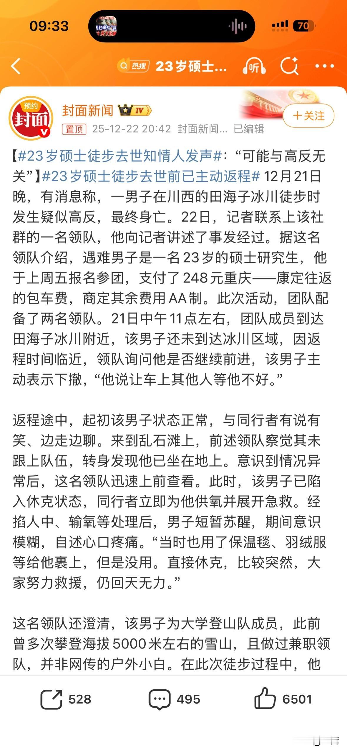 12月21日晚,有消息称,一男子在川西的田海子冰川徒步时发生疑似高反,最终身亡。后来又说与高反无关,是该男子大概率心源性猝死或心梗。 细究一下,这一天是冬至,极阴之日,不应该跑到外面,应该呆在家里。