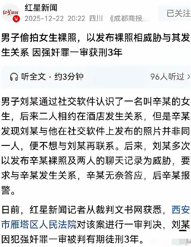 陕西西安,一名女子通过网络结识一名男子,两人交往不到一个月便相约去酒店开房,见面后女子发现对方与照片不符,但还是发生了关系,事后女子想断联,男子却威胁要将聊天记录和女子照片公开,女子无奈再次与男子发生亲密行为,可男子仍不满足,继续威胁。女子忍无可忍报了警,男子的行为,最终被判三年。 两人在网上聊得火热,男子展示的形象体贴多金,照片里的模样也清爽端正。短短一个月,女子觉得遇上了对的人,便答应线下见面。真正见到男子那一刻,男子和照片判若两人,言谈举止也远不如网上那般得体。她感到失望,但碍于情面,还是勉强完成了这次约会,并发生了关系。 回家后女子越想越不对劲,决定结束这段关系。她发信息告诉对方不再联系。谁知男子的真面目立刻暴露出来。他撕下伪装,拿出手机里保存的聊天记录和私密照片,威胁女子若敢断交,就把这些内容发到网上,让她“出名”。 女子吓坏了,她担心自己的照片被传播,害怕被亲友同事指指点点。在极度的恐惧和压力下,她被迫再次与男子见面,屈从了他的无理要求。 男子的贪欲就像个无底洞,一次得逞后,他变本加厉地威胁,把女子的妥协当成了软弱可欺的筹码。他不断索要,甚至提出更过分的要求,试图完全控制女子的生活。 女子每天都活在噩梦裡。对方的短信和电话像催命符,让她精神濒临崩溃。最终一丝残存的勇气让她明白一味退让只会万劫不复,她鼓起所有勇气,走进了派出所报警。 警方接到报案后迅速展开调查,固定了男子违法的证据。法院审理认为,男子利用隐私进行胁迫,严重侵害了被害人的权益,其行为已构成犯罪。最终,这名男子被判处三年有期徒刑,为自己的恶行付出了代价。 虚拟世界的滤镜背后,真实面目需要时间检验,一旦对方开始用隐私要挟,绝不能忍气吞声,第一时间保留证据并报警,才是保护自己最有效的方式。 各位读者你们怎么看?欢迎在评论区讨论。