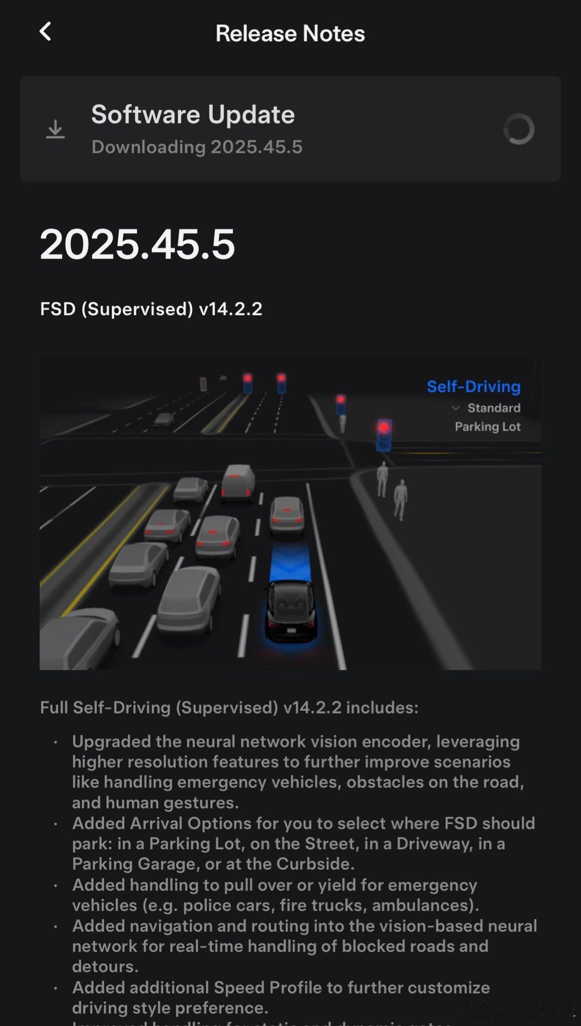特斯拉在北美率先推送推送2025.45.5版本,对应FSD版本为v14.2.2,软件升级内容如下:- 升级了神经网络视觉编码器,利用更高的分辨率功能来进一步改进处理紧急车辆、道路障碍物和人类手势等场景。- 添加了到达选项,让您选择FSD应该在哪里停车:在停车场、街道、车道、停车场或路边。- 增加了紧急车辆(例如警车、消防车、救护车)的停车或让路的处理。- 将导航和路由添加到基于视觉的神经网络中,以实时处理堵塞的道路和绕道。- 添加了额外的速度配置档案,以进一步自定义驾驶风格偏好。- 改进了静态和动态门的处理。- 改善了道路碎片(例如轮胎、树枝、箱子)的抵消。- 改善对几种情况的处理,包括:无保护的转弯、车道变更、车辆切入和校车。- 提高了FSD管理系统故障和从退化操作中顺利恢复的能力,以提高可靠性。- 添加了内部挡风玻璃上可能影响前置摄像头可见性的残留物的警报。如果受到影响,请访问服务进行清洁!- 增加了自动窄场清洗,以提供快速高效的前置摄像头自清洁,并在更高的车辆速度下优化空气动力学清洗。(仅限2026款Y)- 相机可见性可以提高注意力监测灵敏度。(FSD v14.2.1中的新功能)即将改进:- 整体流畅和感性。- 停车位选择和停车质量。特斯拉