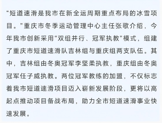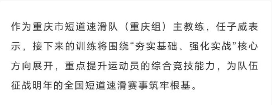 重庆市短道速滑队重庆组成立,任子威担任主教练! 重庆市冬季运动管理中心正式启动短道速滑集训运动员选拔工作,从全市范围内遴选出32名青少年选手进入集训名单。 经过为期30天的系统训练与科学考评,最终21名优秀苗子脱颖而出,正式组建为重庆市短道速滑队(重庆组),冬奥冠军任子威出任主教练。