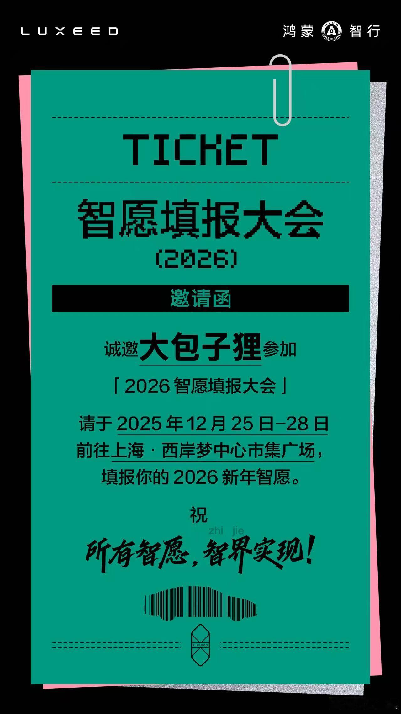 新年要到了,一起来填我的“智愿”!收到一封填“智愿”的邀请函,竟然有点梦回高考的感觉,记得以前重温过学霸考清华的往事,汝之蜜糖吾之砒霜,我这样的学渣就不敢多回忆了……好在这其实是智界汽车发来的年末活动收官体验邀请。话说恰好也是一年前提了智界R7,作为最美华系轿跑SUV,至今感觉颜值依然在线,这一年来不仅辅助驾驶和智能座舱体验快速迭代,甚至在电子后视镜、毫米波雷达上都实现了硬件提升,体验感拉满。这次在上海的西岸梦中心市集广场,智界又做了新年许愿活动,25-28号,方便的小伙伴都可以去看看。智界这次在这里打造了七大体验区,把年轻人的躺平、养生、chill生活、萌宠互动、运动挑战等场景都融合了进来,并把圣诞元素和智界特色的DIY也进行融合。甚至在现场会展示10辆潮改的R7和S7,妥妥的年末潮流出片圣地。记得去年,也是在上海,智界也做过类似的活动,当时提车第一年也许了个愿望,就是希望今年更早一点用上ADS4,那么今年有什么愿望可以许愿呢?期待一下,“智界”出发!2026智愿填报大会智界大有可玩和智界一起通关的2025智界R7智界新S7智界S7和智界一起出发的瞬间