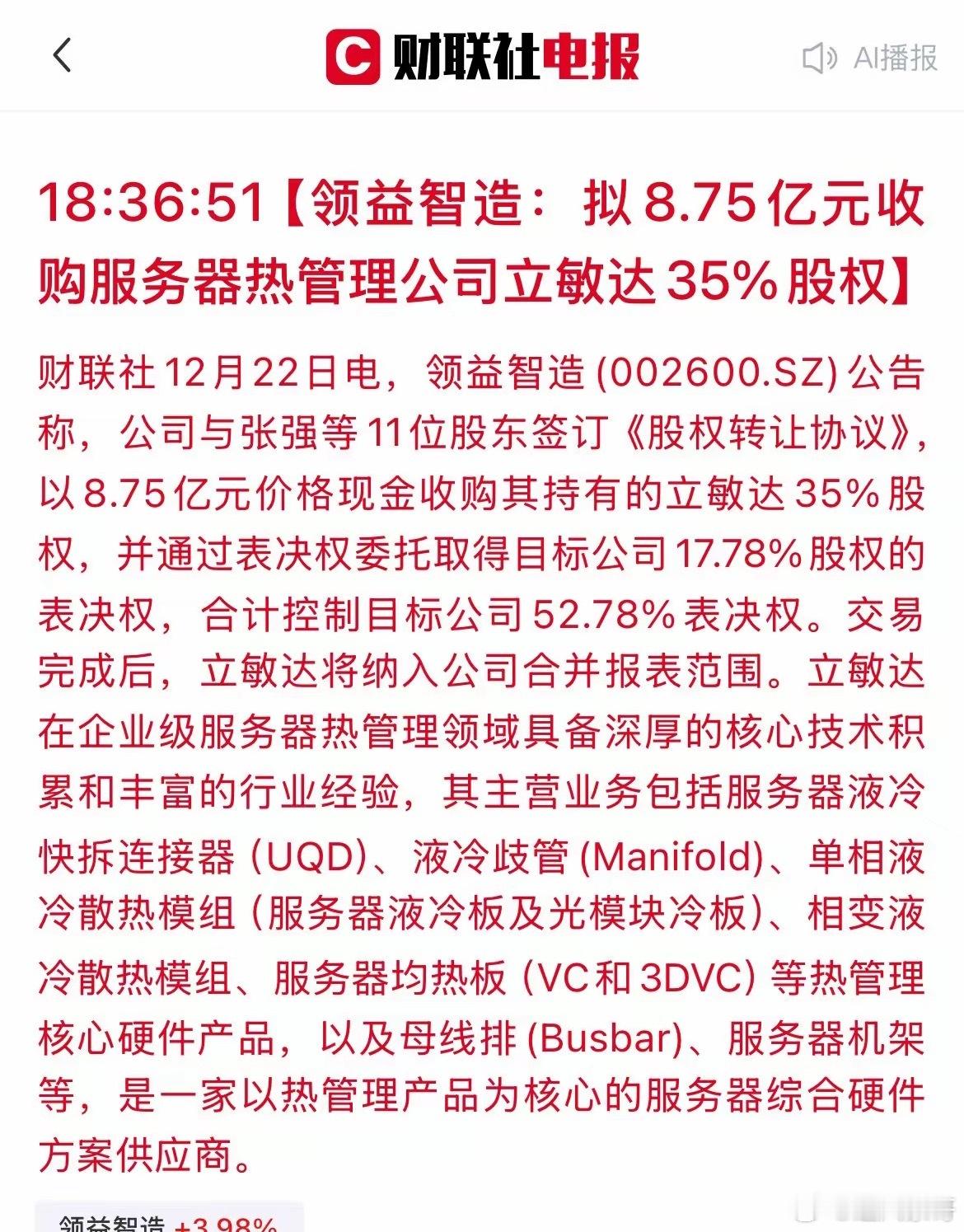 “领益智造”重金押注“AI散热”!8.75亿收购立敏达,锁定液冷黄金赛道!盘后,领益智造发布重磅公告,宣布以8.75亿元现金收购服务器热管理公司立敏达35%股权,并通过表决权委托,合计控制其52.78%表决权。这意味着,这家以精密制造闻名的公司,正式将业内领先的服务器液冷技术纳入麾下。立敏达的核心业务是服务器液冷散热关键硬件,如液冷快拆连接器、散热模组等。随着AI服务器功耗飙升,传统风冷已近极限,液冷技术从“可选”变为“必选”。行业共识是,2025年将成为服务器液冷规模化应用的爆发拐点。领益智造此次收购,意在精准切入这一高增长赛道。此次收购并非孤立之举,而是其既定战略的延伸。此前,公司已高调宣布 “All in具身智能” ,将机器人作为未来核心。无论是AI服务器还是智能机器人,高效热管理都是底层刚需和性能瓶颈所在。通过收购,领益智造不仅切入服务器赛道,更获得了可复用于机器人业务的核心散热技术,强化其作为“关键硬件平台”的定位。市场影响:估值逻辑的再定义。市场或将此交易解读为积极信号。其核心在于,领益智造正试图摆脱传统消费电子精密制造商的单一标签,向 “AI基础设施核心部件(散热)+前沿机器人硬件” 双轮驱动的科技平台转型。若整合顺利,公司有望获得新的成长曲线和估值溢价。