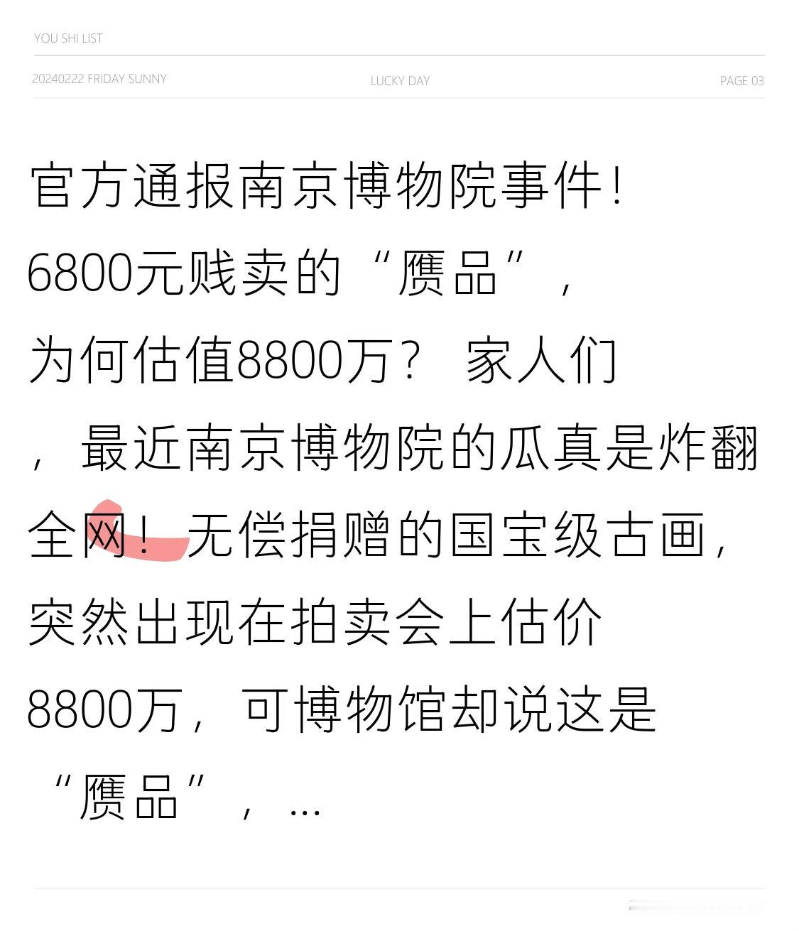 官方通报南京博物院事件!6800元贱卖的“赝品”,为何估值8800万? 家人们,最近南京博物院的瓜真是炸翻全网!无偿捐赠的国宝级古画,突然出现在拍卖会上估价8800万,可博物馆却说这是“赝品”,60多年前就以6800元卖了?官方刚发通报,里面的反转和疑点,真是越扒越让人揪心! 这事得从1959年说起,收藏界大佬庞莱臣的后人,怀着对国家的信任,把137件“虚斋旧藏”无偿捐给了南京博物院,其中就包括明代大师仇英的《江南春》图卷。要知道庞家的收藏可是“江南收藏甲天下,虚斋收藏甲江南”,这些宝贝本该是供人瞻仰的文化瑰宝。 可谁能想到,2025年这幅画突然在北京某拍卖会上亮相,估价直接飙到8800万!庞家后人一看当场懵了,赶紧去南博核查,结果发现包括《江南春》在内的5幅画全没了踪影。这才有了后来的起诉和强制执行申请,要求博物馆说清画作去向。 就在大家都以为是文物失窃时,官方通报来了个大转折:南博说这5幅画在1961年和1964年,经张珩、谢稚柳等权威专家两次鉴定,全是“赝品”。上世纪90年代按规定划拨给省文物总店,2001年以6800元卖给了私人,销售清单写的是《仿仇英山水卷》。 但疑点根本经不起细抠!其一,庞家世代收藏,捐的都是珍品,怎么可能一次性捐5件赝品?其二,鉴定结果和处置情况,为啥六十多年都不告诉捐赠人家属?其三,当年6800元卖的“仿品”,如今怎么成了估值近亿的“真品”? 更让人寒心的是,捐赠人捐的不仅是文物,更是对国家文化保护的信任。不管这画是真是假,博物馆都该守住底线:鉴定要公开透明,处置要及时告知,流向要全程可查。可现在呢?一边是捐赠人不知情,一边是“赝品”变天价,中间的流程却模糊不清。 这事之所以让全网关注,不只是因为天价古画的纠纷,更因为它戳中了所有人的痛点:我们愿意相信博物馆是文物的守护者,但绝不能容忍“暗箱操作”的可能。文物是国家的瑰宝,更是民族的记忆,每一件都该被认真对待。 官方通报说会深入核查,若有违法违规必严肃处理。我们期待一个水落石出的结果,不仅是给庞家一个交代,更是给所有文物捐赠者、给全社会一个交代。毕竟,信任一旦崩塌,再想重建就难了。 你觉得这幅《江南春》到底是真是假?博物馆的处置流程合规吗?欢迎在评论区聊聊你的看法,点赞关注,咱们持续跟进最新进展!