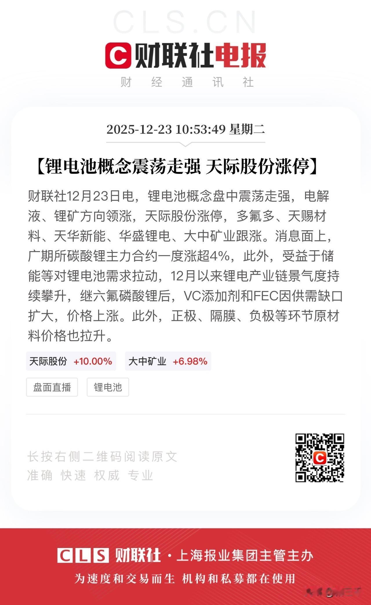 调整到位!电池板块回归上涨行情! 本着强者恒强的思路, VC添加剂、电解液继续领先: 天际股份、多氟多、天赐材料领涨, 永太科技和新宙邦排在大哥们后面。 锂矿资源股继续是大中矿业领涨, 赣锋锂业和天齐锂业胜在稳! 锂电池正负极材料龙头分别是: 湖南裕能、中科电气, 正极材料成本占比高, 所以业绩释放潜力大于负极材料, 但竞争压力也大! 储能电芯依旧一般, 龙头亿纬锂能可圈可点吃市场份额优势, 派能科技等中小公司就要等涨价行情传导过来! 保持耐心! …