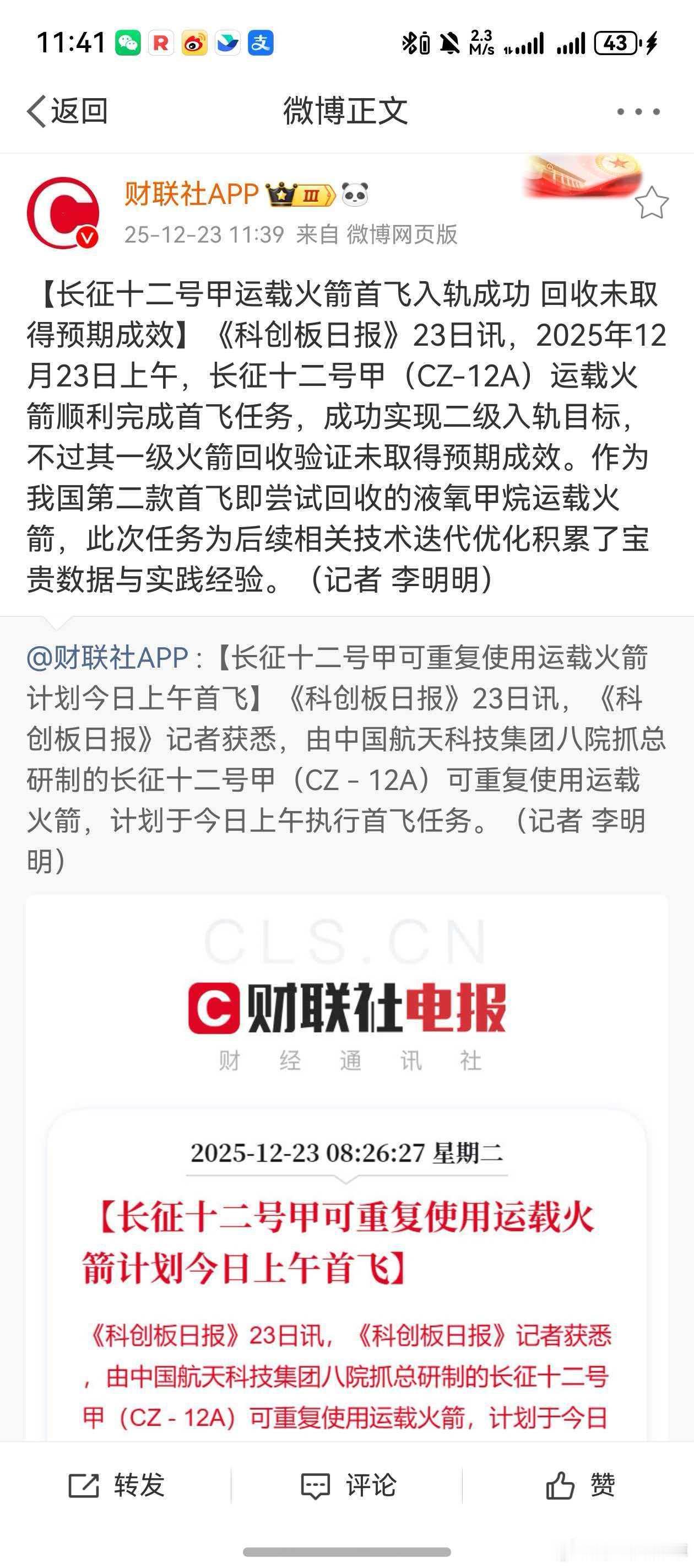 早上A股市场商业航天板块上串下跳的,看来长征12甲的情况,跟前段时间蓝箭航天的朱雀3的情况差不多。财联社的消息印证了猜想。长征十二号甲火箭回收失败全网热点共创计划