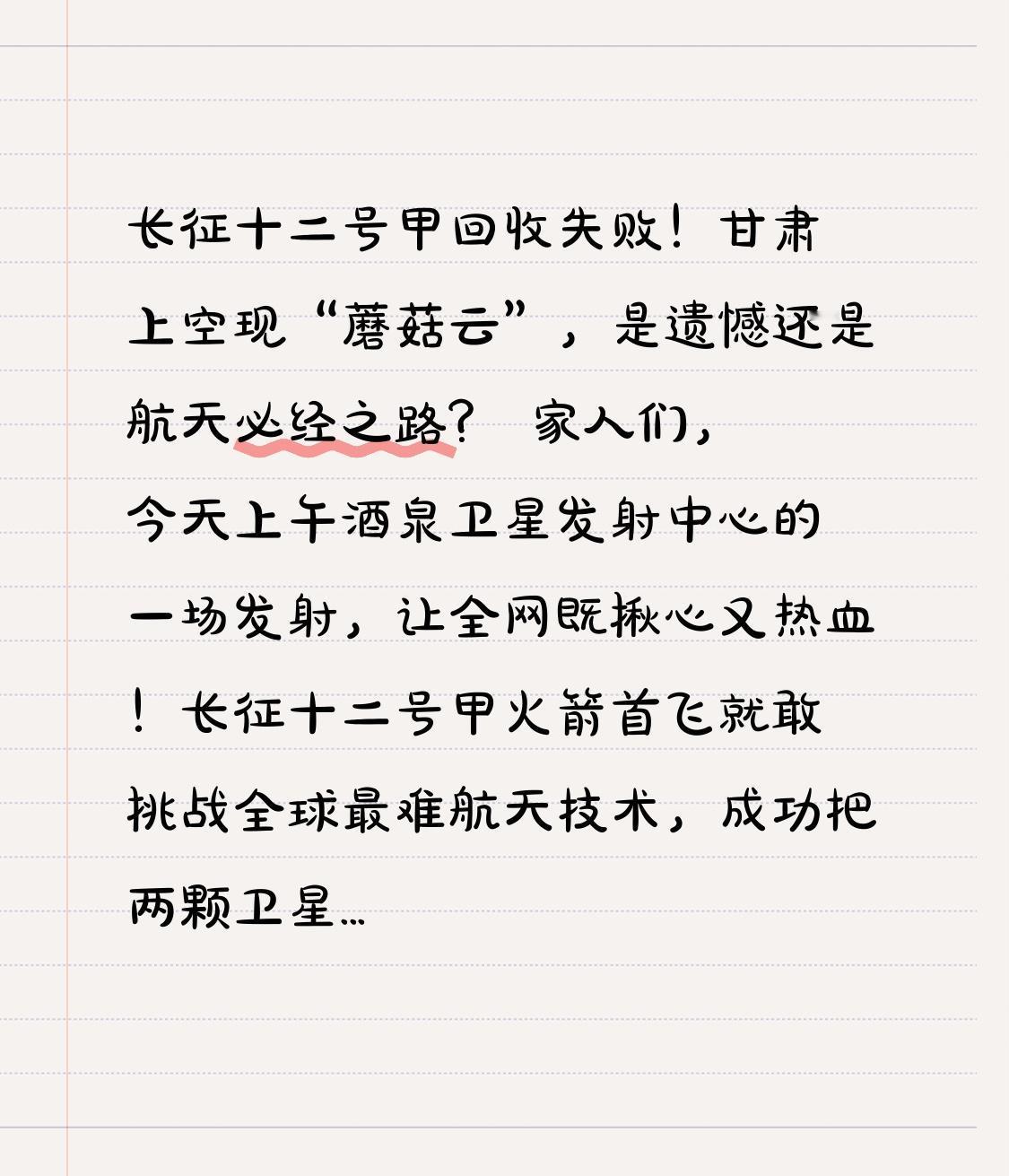 长征十二号甲回收失败!甘肃上空现“蘑菇云”,是遗憾还是航天必经之路? 家人们,今天上午酒泉卫星发射中心的一场发射,让全网既揪心又热血!长征十二号甲火箭首飞就敢挑战全球最难航天技术,成功把两颗卫星送入预定轨道,可关键时刻一级火箭回收突发异常,残骸坠落在甘肃民勤回收场边缘,现场升起的“蘑菇云”瞬间刷屏全网! 可能有人会说“这不是失败了吗”,但先别急着下结论!要知道,这枚火箭可是全球首个首飞就敢冲垂直回收的液氧甲烷火箭,难度堪比从万米高空扔一支铅笔,还得让它竖直站稳在10米范围内。它搭载7台能反复启停的“龙云”发动机,本来计划四次点火减速后平稳着陆,结果着陆段一台发动机重启失效,导致速度失控未能软着陆。 但转折点来了——这次任务绝不是白忙活!卫星精准入轨,说明火箭核心发射能力完全达标,而且回收过程中的制导、姿态控制等关键技术都得到了实战验证。更关键的是,它用的液氧甲烷燃料是“清洁汽油”,烧完无积碳,能重复使用50次以上,还能把发射成本降低60%,未来低轨卫星组网、甚至火星探索都离不开这项技术。 想想SpaceX的猎鹰9号,早期曾连续失败24次才搞定回收技术,咱们国家队首次尝试就摸到了关键门道,已经远超同期水平。而且这次失利没有造成任何人员伤亡,故障原因也锁定在发动机重启和着陆控制环节,这些宝贵数据比一次成功更有价值,能帮后续任务避开无数坑。 网上有人质疑“首飞就挑战回收太激进”,但中国航天从来不是靠保守走到今天的。从神舟飞天到嫦娥探月,从祝融探火到空间站建成,哪一次突破不是在风险中摸索?这次“国家队+民企”协同创新,民营发动机首次纳入国家航天型号,本身就是打破常规的进步。 咱们之所以为这件事揪心,是因为每个人都懂:航天探索从来没有平坦大道。那些看似“失败”的尝试,都是通往星辰大海的铺路石。就像官方说的,明年上半年会针对性开展专项验证,稳定回收的闭环很快就能实现。 中国航天的浪漫,不仅在于成功时的万众瞩目,更在于面对挫折时的永不言弃。这次回收失利不是终点,而是让我们离低成本航天、深空探索更近了一步。向每一位航天人致敬,他们敢闯敢试的勇气,正是我们民族不断前行的底气。 你觉得下次长征十二号甲回收能成功吗?欢迎在评论区聊聊你的看法,点赞关注,一起为中国航天加油!
