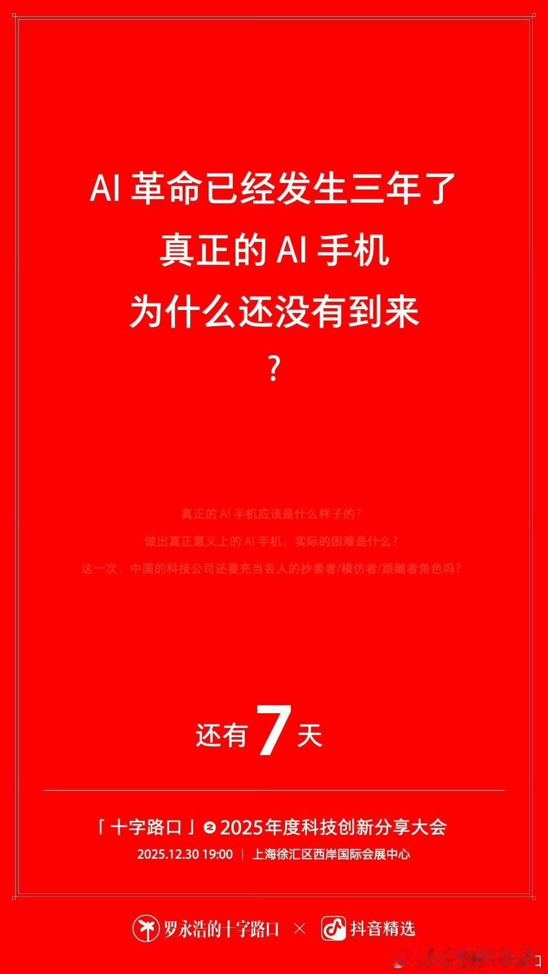 哈哈,这红底白字海报太有感觉了,仔细看还有三行红字: 真正的 AI 手机应该是什么样子的? 做出真正意义上的 AI 手机,实际的困难是什么 这一次,中国的科技公司还要充当丢人的抄袭者/模仿者/跟随者角色吗? 不知道罗老师这次要推荐哪款 AI 手机?豆包手机助手?[思考]