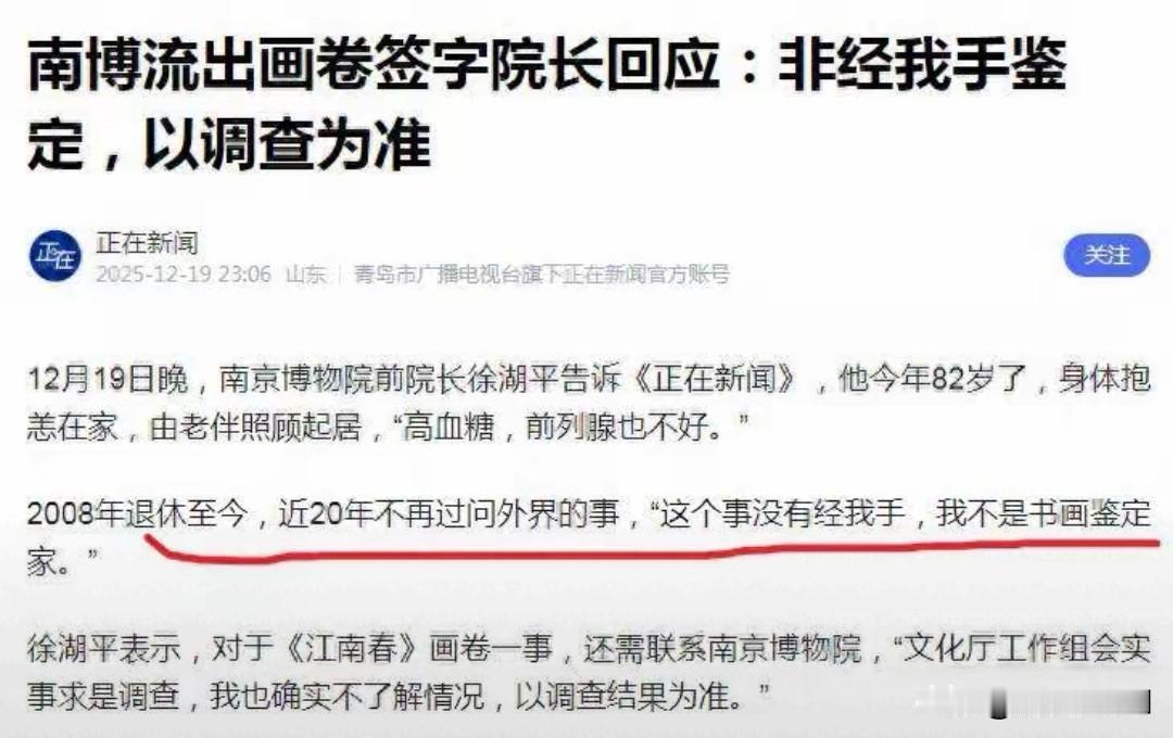 南京博物院前院长徐湖平“退休不管事”?档案和活动记录啪啪打脸! 徐湖平去年底受访时一口咬定,1997年《江南春》图卷移交文物总店的事他没掺和,还说自己2008年退休后彻底“躺平”。结果新华社反手甩出档案,上面明晃晃有他签名,日期对得上,责任跑不掉。 这老爷子嘴上说退休后两耳不闻窗外事,实际活动多到飞起。2024年6月收藏家协会展会上,他超时狂侃40分钟,劝藏家“别只认钱”;2025年1月又跑去星云大师书法展当嘉宾,大谈佛教文化。这些全是公开场合,镜头前比在职时还活跃。 徐湖平玩的是“选择性失忆”——用院长身份刷存在感,但涉及历史责任就装糊涂。档案和活动记录像照妖镜,照出他既要面子又不想扛事的拧巴心态。 “退休了还蹭院长光环,出事就甩锅,这波操作666!”有人翻出类似案例:某高校领导退休后四处演讲,但一提当年学术纠纷就装聋作哑。 文物圈最恨这种“人走茶不凉,责任全抛光”的做派。若继续被扒皮,怕是要晚节不保。 “您老这退休生活,比上班还忙乎呢?”评论区聊聊您的看法。