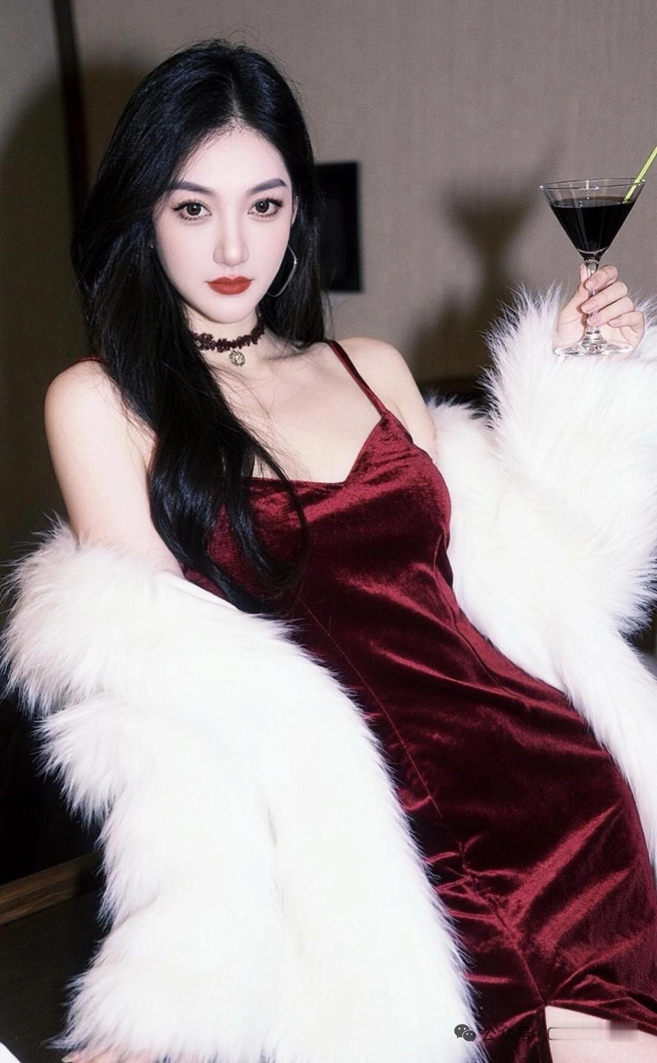 红衣美人饮,白羽拂风姿。高雅气质美女