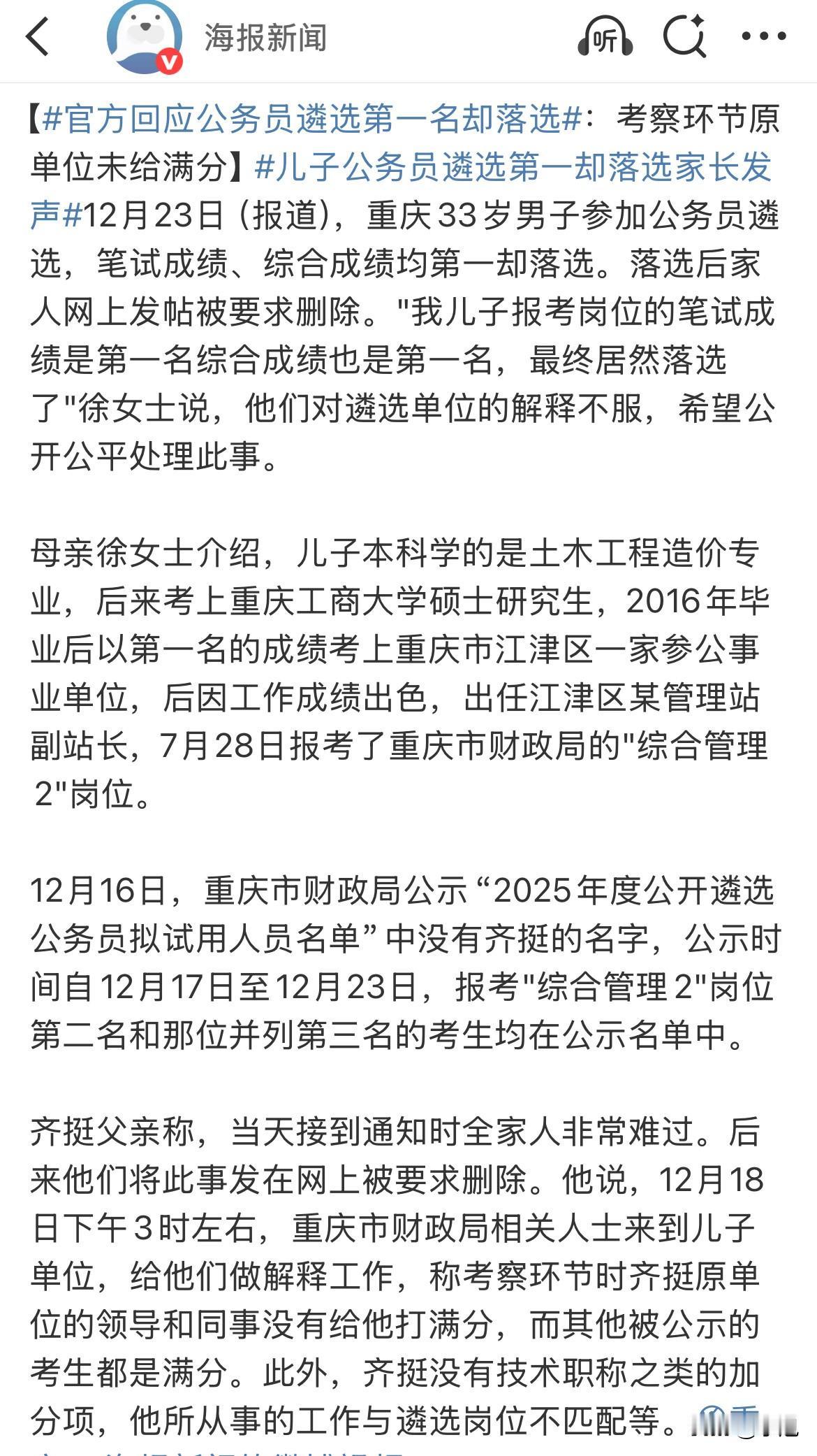 重庆一个考生,参加了重庆市财政局的公务员遴选,一路过关斩将,成绩全是第一名,全家都以为稳了。结果等到最后公示,傻眼了:录了第二、第三名,偏偏没录他这个第一。 这事最近网上热议,官方后来给了说法。总结起来,刷掉他这个“双第一”的理由,主要就三条: 第一,考察环节扣了分。去他原单位谈话了解,据说领导和同事没给打满分。 第二,人岗匹配度不够。认为他以前的工作经历,和现在报考的财政岗位不太沾边。 第三,最新最重的说法:档案存疑。当地部门最新回应里明确提到了,他“人事档案中有关事项存在疑点”。 但恰恰是这些理由,让很多人觉得更疑惑了。 如果说能力不行,那笔试面试的分数是怎么考到第一的? 如果说单位评价不高,他自己和家人却表示人缘挺好,这中间是不是有信息差? 最让人琢磨的是“档案存疑”这四个字。到底疑在哪里?是学历?是经历?还是别的什么?没说清楚。一个模糊的理由,否掉了一个清晰的第一名,这很难让公众信服。 公务员遴选,大家最看重的就是“公平”二字。公平不光要看考场上的分数,也要看考场外的评价标准是否公开透明。像“考察打分”、“档案审核”这些环节,有没有一把清晰可见的尺子?能不能经得起追问? 这件事,伤的是一个考生的心,挑战的却是大家对选拔程序的信任。大家都理解“择优录取”,但这个“优”到底怎么定义,标准必须清清楚楚、明明白白。把那些不为人知的环节,尽可能地晒在阳光下,才是对所有考生真正的负责,也是对我们社会公平信念最好的守护。
