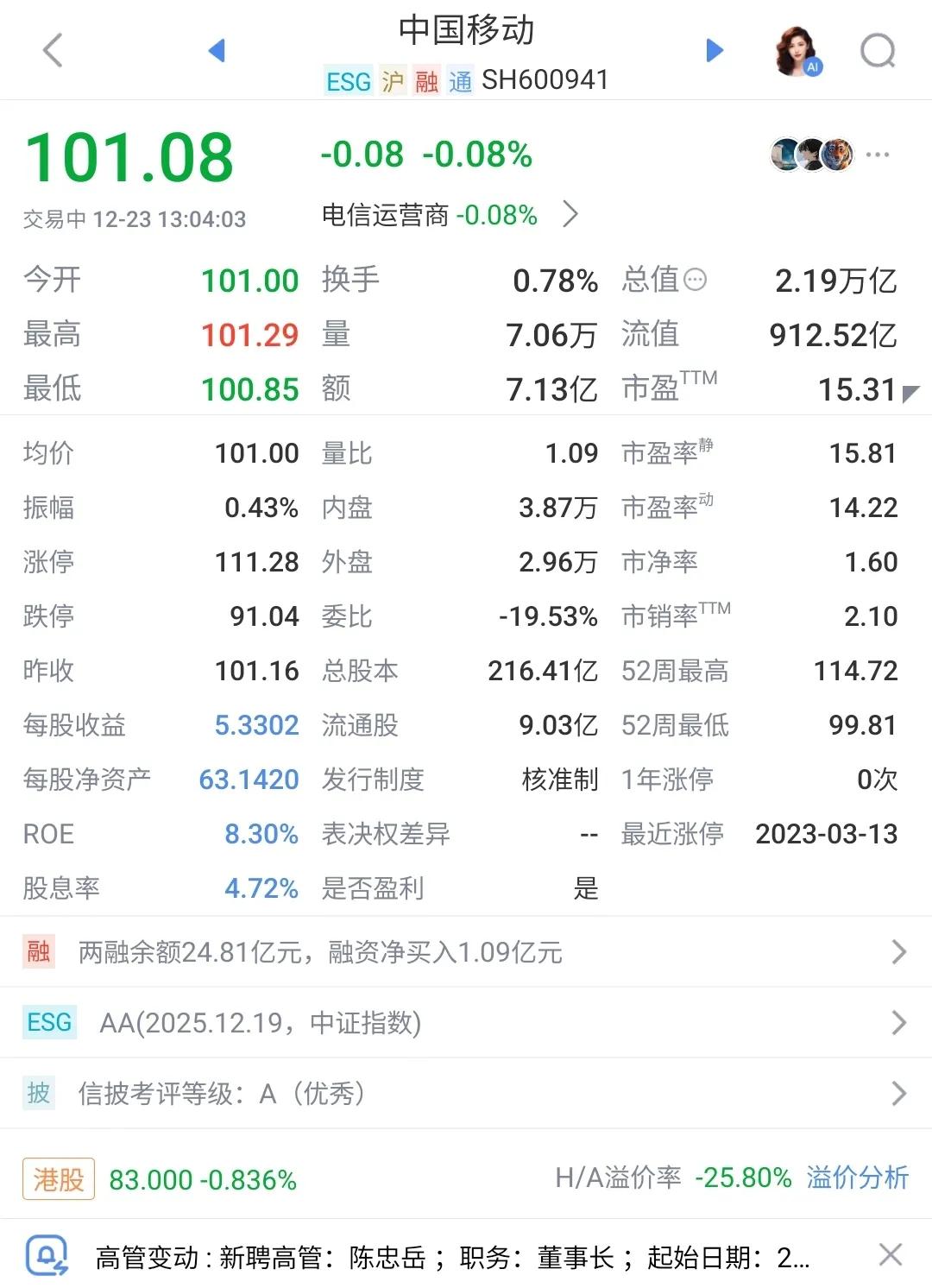 有一种痛叫持有中国移动(图1)。与腾讯、阿里、京东不断回购自家股份并注销相比,中国移动的内部员工奖励股,在不断地稀释股东的股份[发怒][大哭][打脸][捂脸]。并且,中国移动大手笔投入AI新业务,后期资本开支将可能大幅上升,或挤占分红。 从2025年1月6日到12月9日,中国移动因员工奖励股份,股权膨胀了多少(图2)? A股员工奖励计划:216.41-215.17=1.23亿股, H股员工奖励计划:207.39-206.17=1.22亿股, A+H股员工奖励计划:1.22+1.23=2.45亿股, 期初总股本:215.17+206.17=421.34 股份年化稀释率:(2.34÷421.34)÷11×12=0.6059% 股权年化被稀释0.6%,对一个本身是低增长的公司就很致命。请看(图3),中国移动三季报的营业收入同比增长是0.5%,还不够股权稀释的[捂脸][大哭] 更要命的是,中国移动的“股权激励(稀释)计划”,目前尚不知何时终止,后续会不会没完没了,完全看管理层的心情,股民根本无法阻止。