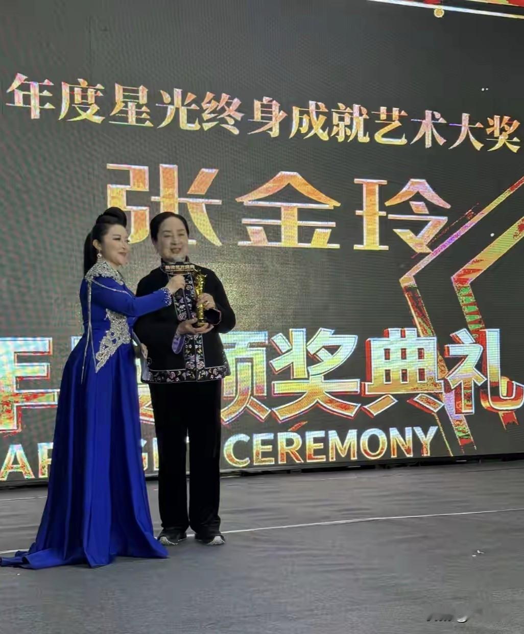 张金玲精心打扮一下漂亮多了,74岁的她,身材还是保持得很不错 不知这个终身成就艺术奖是啥奖?书画还是表演?