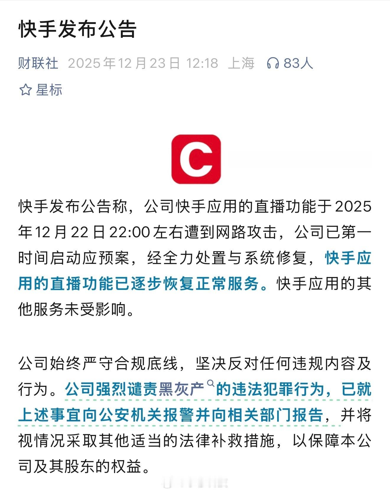 快手发布公告了,已修复和恢复直播功能,已报警,坚决保障公司和股东的权益,这个保障的权益方是不是搞错了