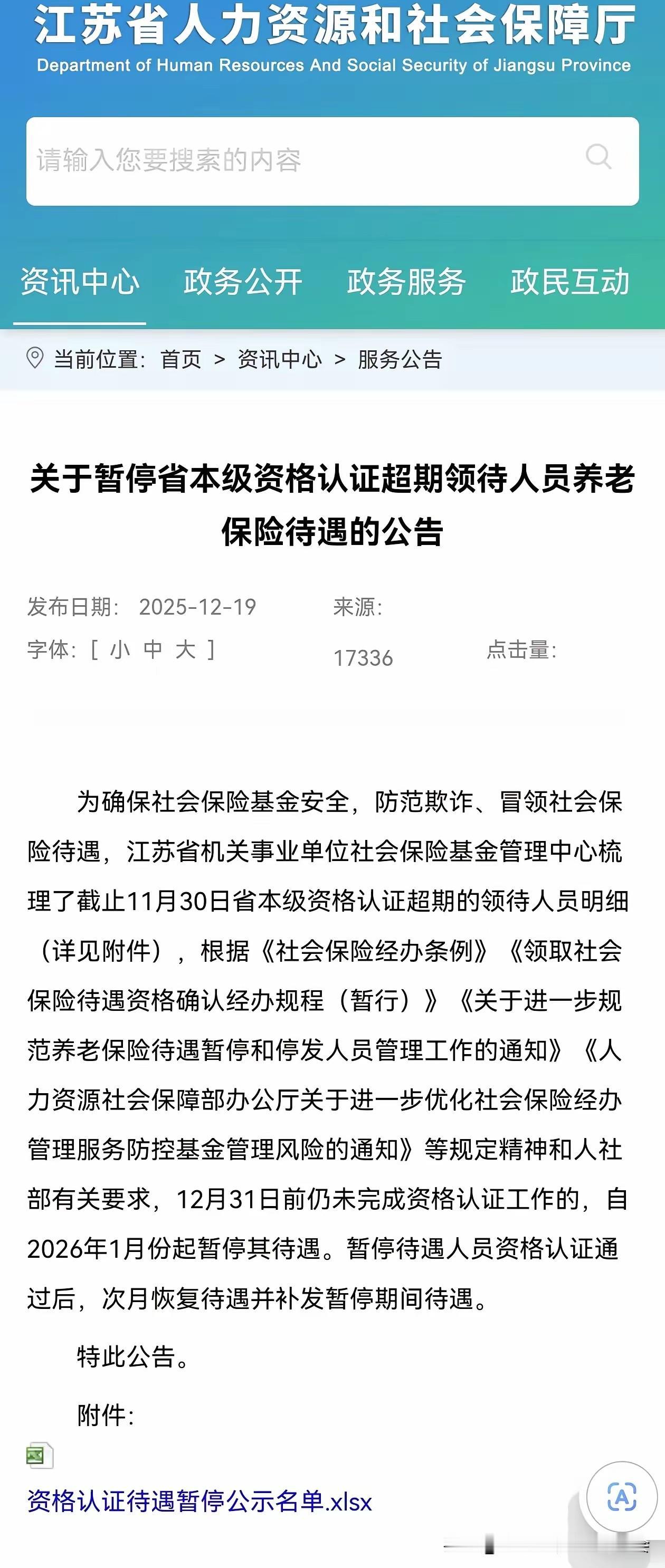 提醒!!!2766名退休人员因逾期未完成养老金领取资格认证,面临2026年1月起待遇暂停。这非政策加码,而是维护社保基金安全的常规动作,旨在杜绝“死亡冒领”。 易遗漏群体常为高龄独居、异地居住或政策信息接收不畅的老人。当前认证已从过去的“集中现场办”发展为“手机刷脸自助办”(如“江苏智慧人社”APP)为主,并正走向利用医疗、出行等大数据进行“静默认证”的未来模式。养老金认证 养老资格认定 养老金资格 养老金验证 江苏养老金 江苏职工养老金 养老金延迟 江苏退休 养老金空窗期 内蒙古养老认证 养老金查错 养老金预警 社保费认证 养老金空窗期 内蒙古养老认证 养老养认证 养老金查错 养老金预警 养老资格待遇 养老金停征 受影响人员需立即通过APP、小程序或12333热线核查并完成认证。即便暂停,补认证后待遇将恢复并补发。此事凸显社保服务正朝更精准、无感、人性化方向演进,其核心是在保障基金安全与提供便民服务间寻求最佳平衡。