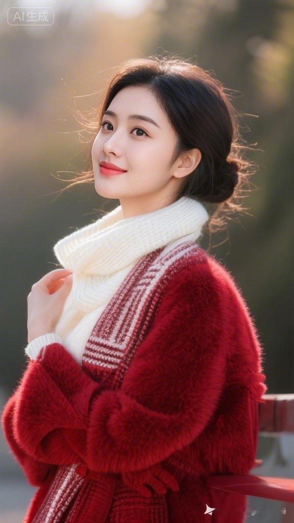 冬日暖阳下的甜美少女,粉色外套与红色围巾的完美搭配,尽显温柔与时尚。