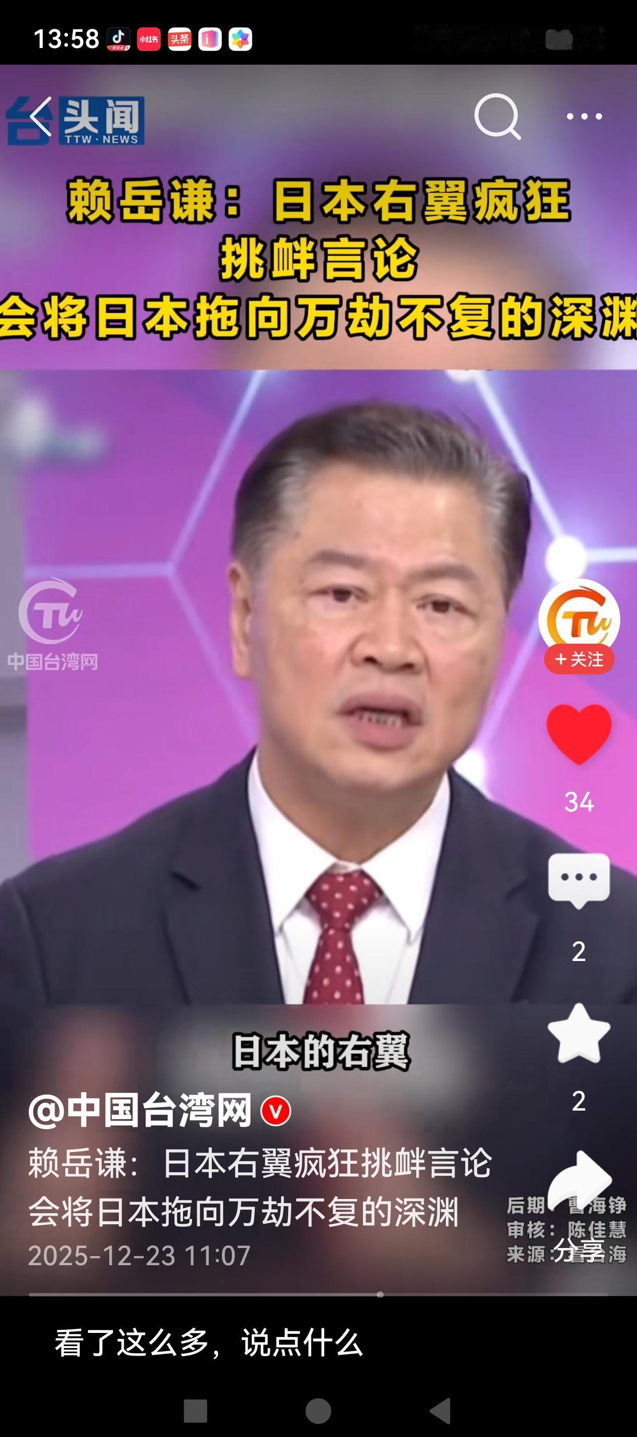 赖岳谦称,日本右翼疯狂的挑衅言论,会将日本拖向万劫不复的深渊。他认为,这种没有底线的挑衅,潜台词就是要跟解放军交战,其结果只能是把日本的年轻人拖上战场,而且是在日本本土的战场。这无疑是日本人民的最大灾难! 俗话说,旁观者清,而作为始作俑者的高市早苗难道预想不到她的疯狂言论会带来如此严重的后果?当然不是,但她为了自己的政治目的,是不会考虑日本人民会否遭受灾难,否则,她就不会无视日本民众反对的声音。日本军国主义者之所以成为战争贩子,是因为他们骨子里就是反人类的。一个战犯国家不能认真反省自己的战争罪性,最终只能走向灭亡!