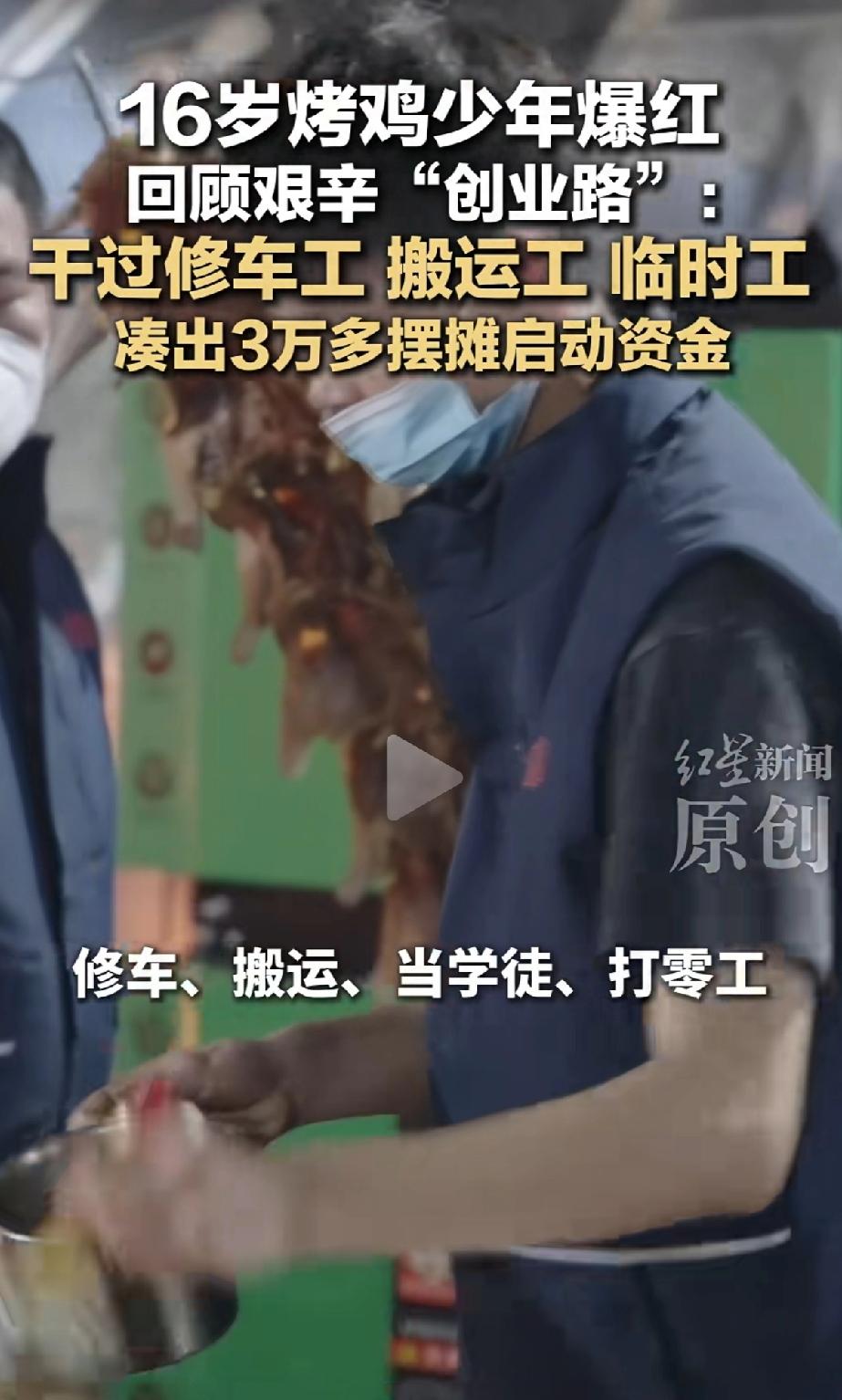 16岁少年背后一定有高人指点! 烤鸡爆火后既没有飘,也没有卖惨 更没有宣扬,偏偏在记者提问时,他回:我14辍学这个话题不希望用在别人身上。 倒不是他怕别的辍学少年来抢他的饭碗,而是他辍学的原因,只是因为家里确实太穷,只想减轻父母负担。 人家读书成绩也不差,不然也不会条理清晰地表达出:一个有文化的人,跟一个没文化的人,在一起说话都不一样。 少年甚至说很愧疚,也很后悔,觉着这种路是弯的,读书的路却是直的。他认为自己这个群体是要在弯路跌跌撞撞的,既然选择了,那就把它做好,做到极致,也是种热爱。 别看小孩年纪不大,说的话却很有道理,话说回来,他跟鸡排哥不一样,如果他宣扬自己这条路有多好,那估计会被很多人说他是传播的不是正向价值观。 其实老话早就讲了:三百六十行,行行出状元!只要不危害社会,也只要他能靠自己的努力踏实进取,做出成绩来,都应该被宣扬!不丢人!而不是只有考试升学才是正途!大家说对不对?