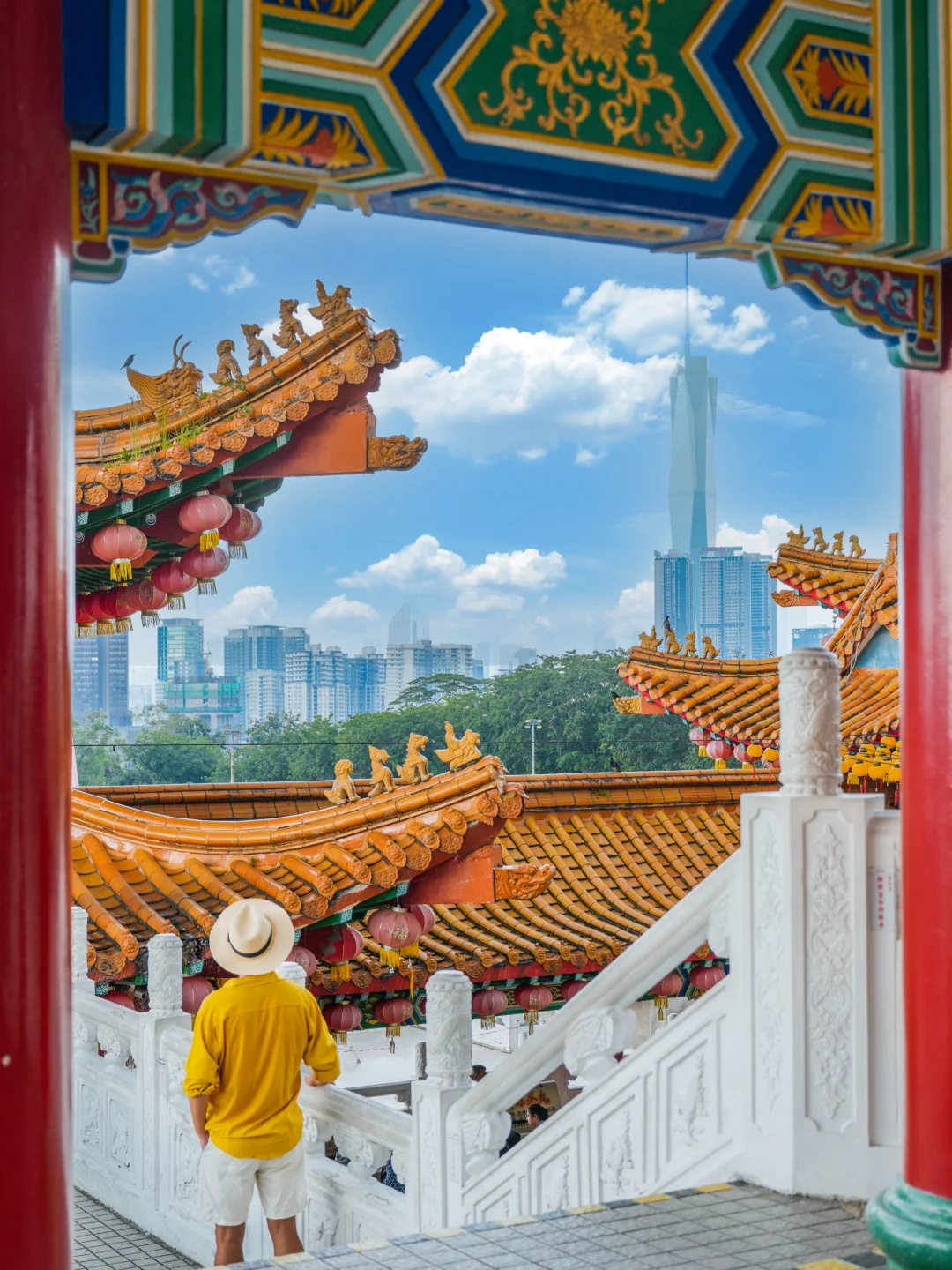 中式红色古建与吉隆坡地标吉隆坡塔、默迪卡118高楼同框。