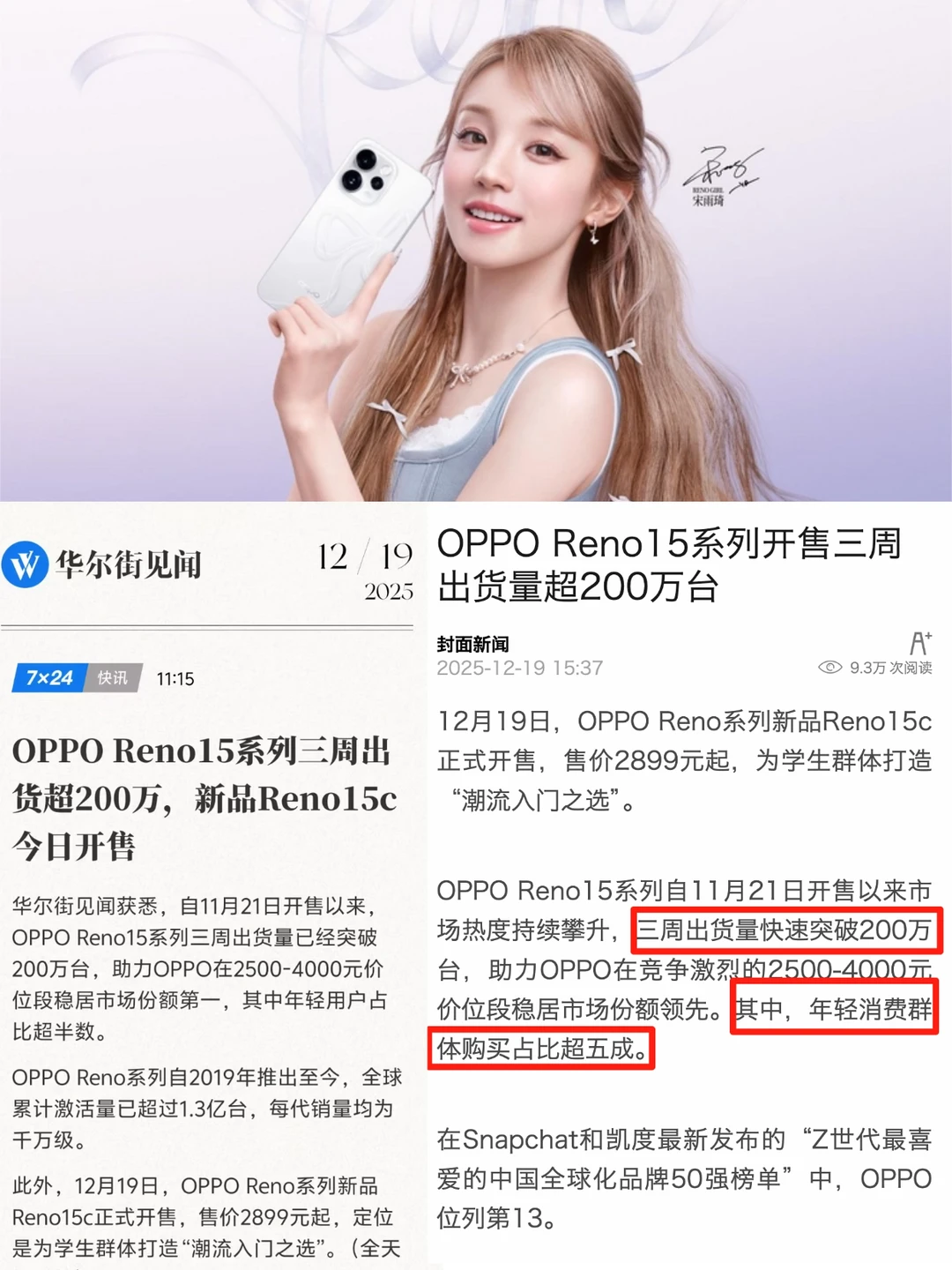 前几天就有报道都说Reno15系列出货量已经超过200万台,只用了3周时间,而且其中有一半是年轻人,就同事手里的这款体验下来我觉得还挺好~