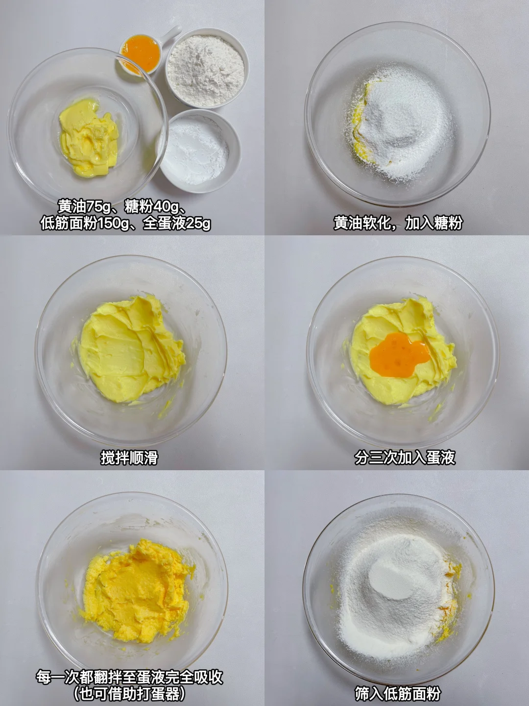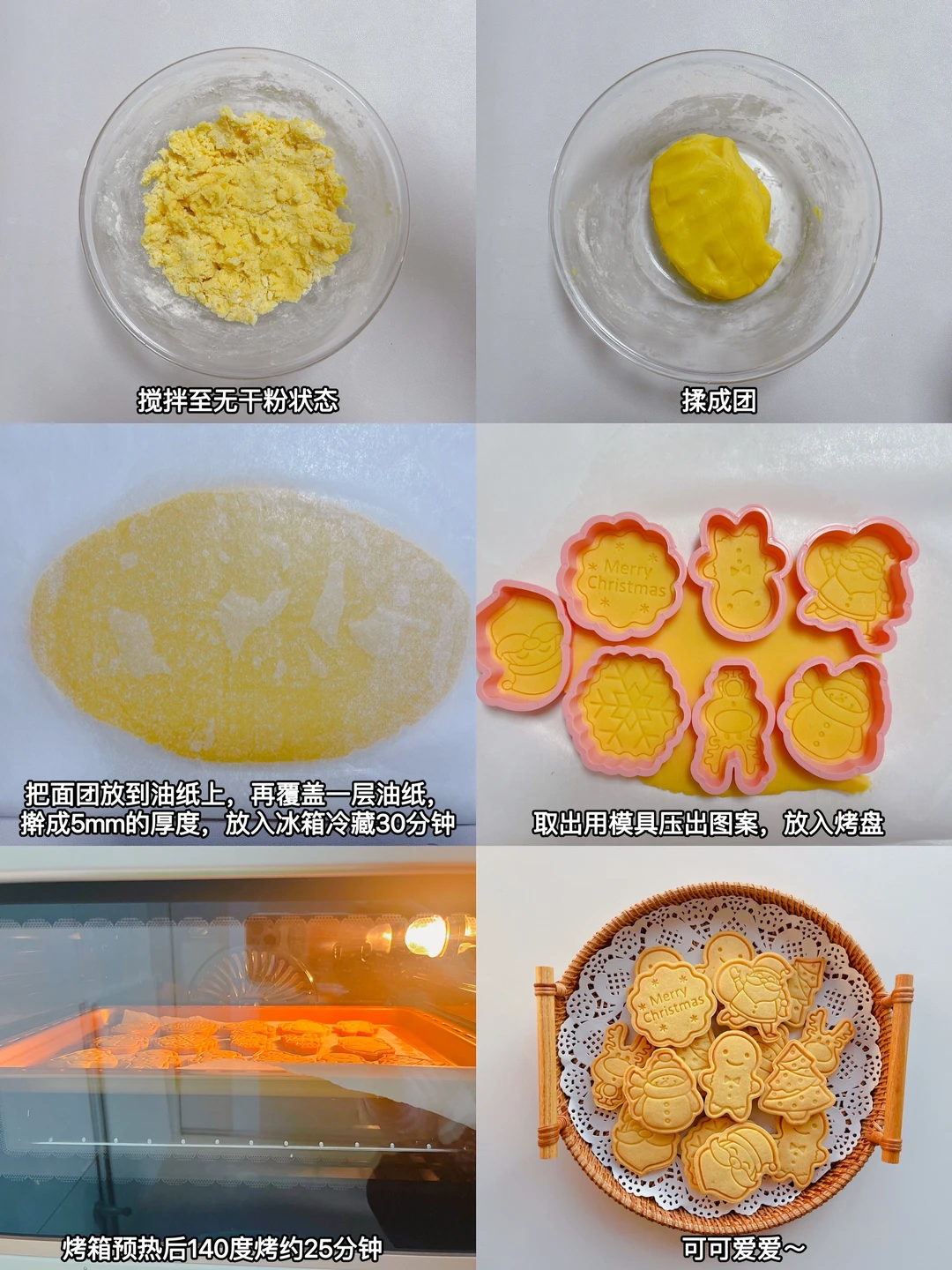 🎄圣诞节快到啦,氛围感满满的黄油小饼干安排上~酥脆好吃,简单易做,烘焙新手也可一次成功,快来试试吧[派对R] 👩🏻🍳 材料:黄油75g、糖粉40g、低筋面粉150g、全蛋液25g 【小贴士】 1.鸡蛋用常温的,冷藏的需要提前拿出室温放置 2.每个烤箱都有它的脾气,大家需要根据实际情况进行调整