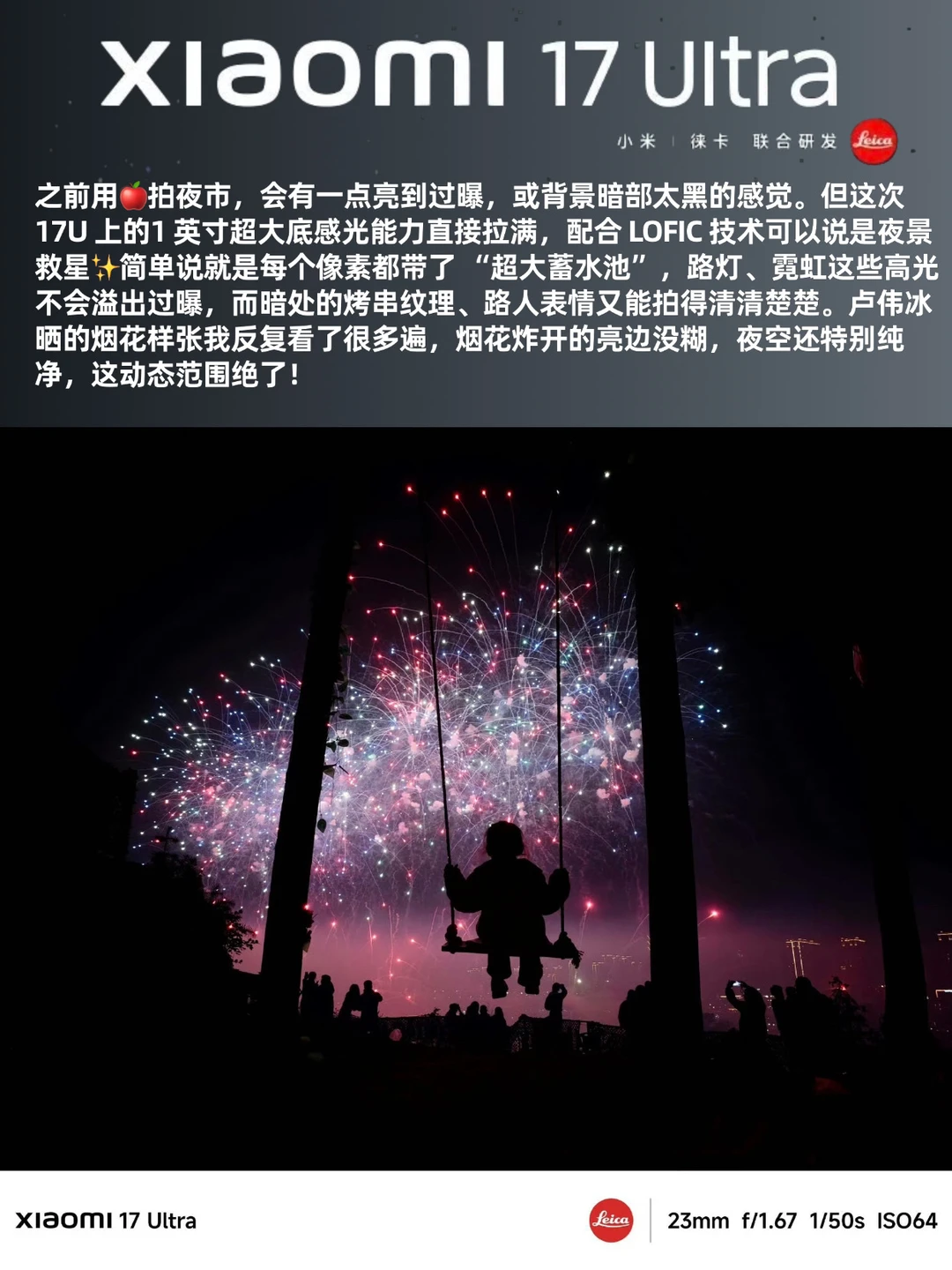 中立说说:之前用🍎拍夜市,会有一点亮到过曝,或背景暗部太黑的感觉。但这次 17U 上的1 英寸超大底感光能力直接拉满,配合 LOFIC 技术可以说是夜景神器 ✨简单说就是每个像素都带了 “超大蓄水池”,路灯、霓虹这些高光不会溢出过曝,而暗处的烤串纹理、路人表情又能拍得清清楚楚。卢伟冰晒的烟花样张我反复看了很多遍,烟花炸开的亮边没糊,夜空还特别纯净,这动态范围绝了!