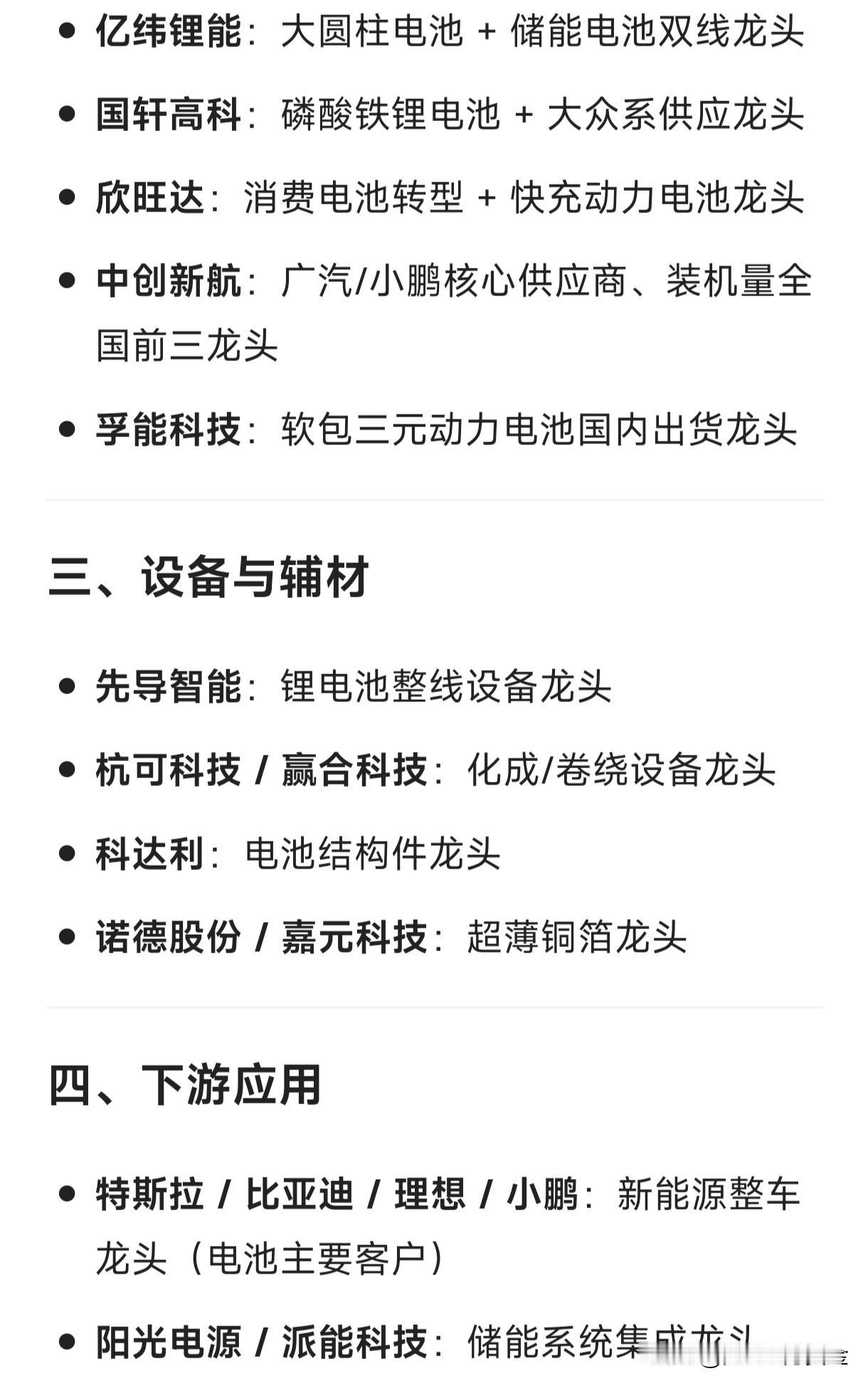 电池产业链各核心龙头公司 一、上游材料 宁德时代 / 比亚迪:电池回收与材料闭环龙头 天齐锂业 / 赣锋锂业:锂资源龙头 华友钴业 / 格林美:钴镍资源及前驱体龙头 容百科技 / 当升科技:高镍三元正极龙头 德方纳米 / 湖南裕能:磷酸铁锂正极龙头 贝特瑞 / 璞泰来:负极材料龙头 天赐材料 / 新宙邦:电解液龙头 恩捷股份 / 星源材质:隔膜龙头 二、中游制造 宁德时代:全球动力电池 + 储能电池双龙头 比亚迪:刀片电池 + 整车垂直整合龙头 亿纬锂能:大圆柱电池 + 储能电池双线龙头 国轩高科:磷酸铁锂电池 + 大众系供应龙头 欣旺达:消费电池转型 + 快充动力电池龙头 中创新航:广汽/小鹏核心供应商、装机量全国前三龙头 孚能科技:软包三元动力电池国内出货龙头 三、设备与辅材 先导智能:锂电池整线设备龙头 杭可科技 / 赢合科技:化成/卷绕设备龙头 科达利:电池结构件龙头 诺德股份 / 嘉元科技:超薄铜箔龙头 四、下游应用 特斯拉 / 比亚迪 / 理想 / 小鹏:新能源整车龙头(电池主要客户) 阳光电源 / 派能科技:储能系统集成龙头