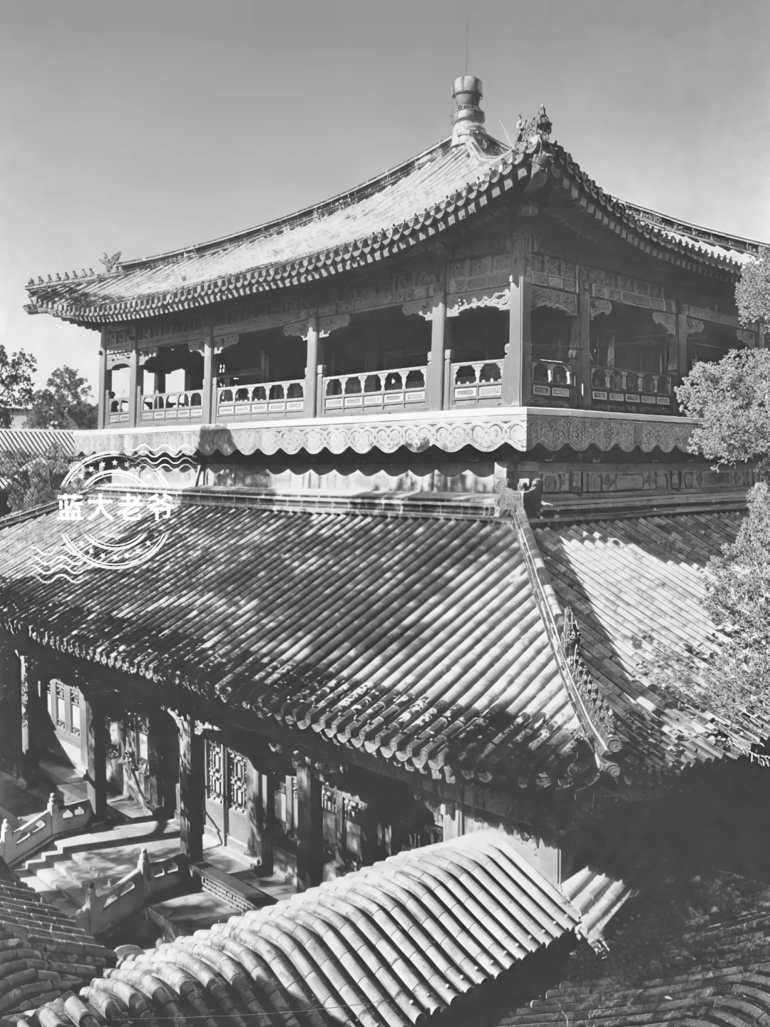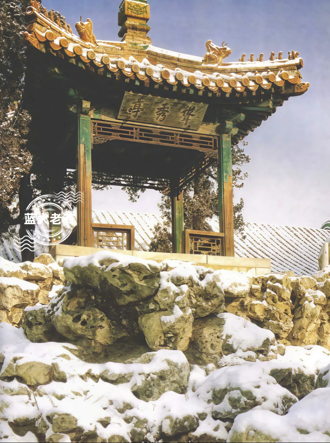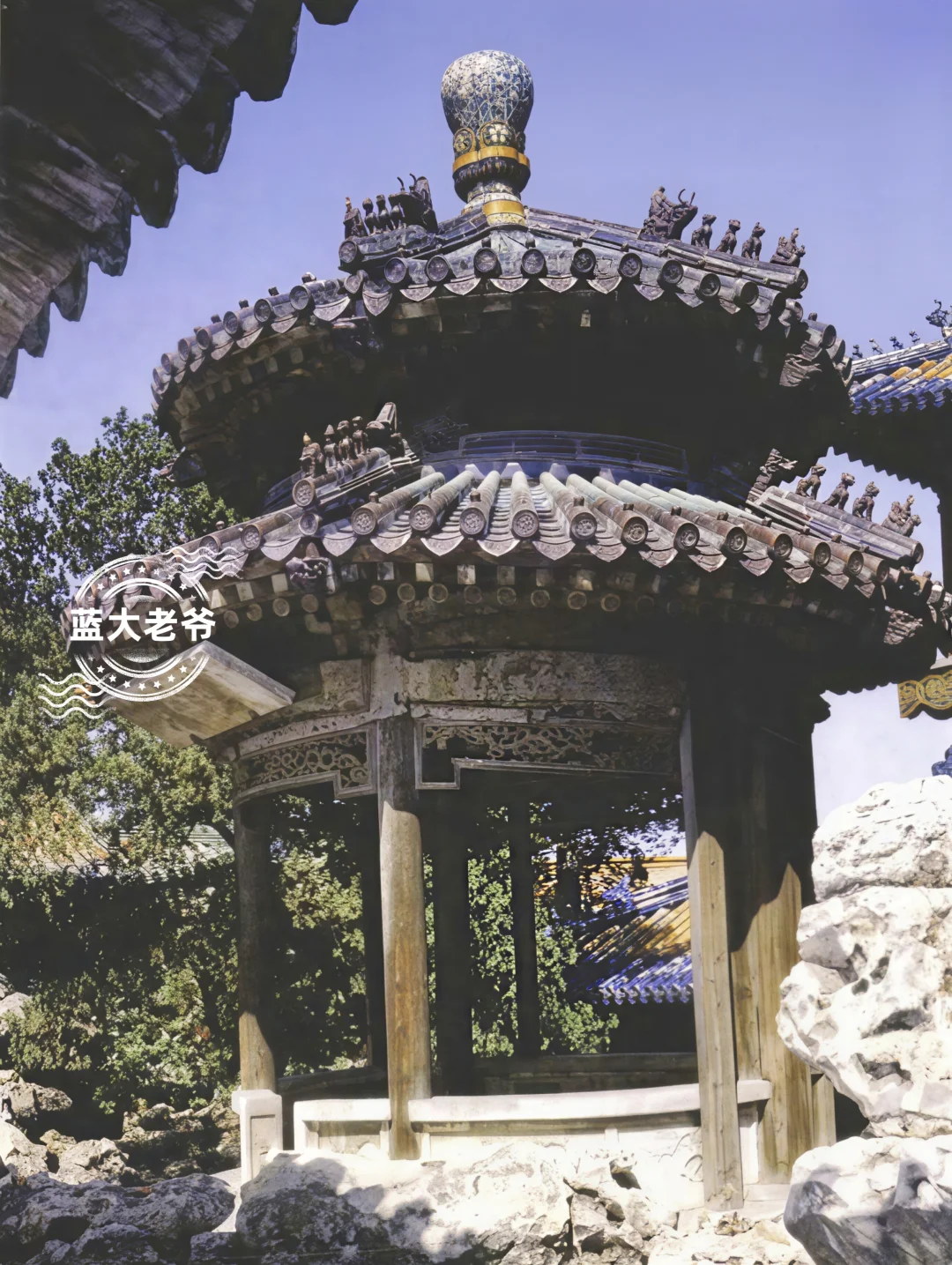 🔟四进修缮前的碧螺亭,坐落于东部假山主峰上,著名的梅亭,五柱重檐攒尖紫琉璃瓦顶,亭内外雕绘众多精细的梅花梅枝图案,蓝绿色调,重檐每层五坡五条垂脊,亦仿梅花五瓣,亭南有小石桥通萃赏楼。