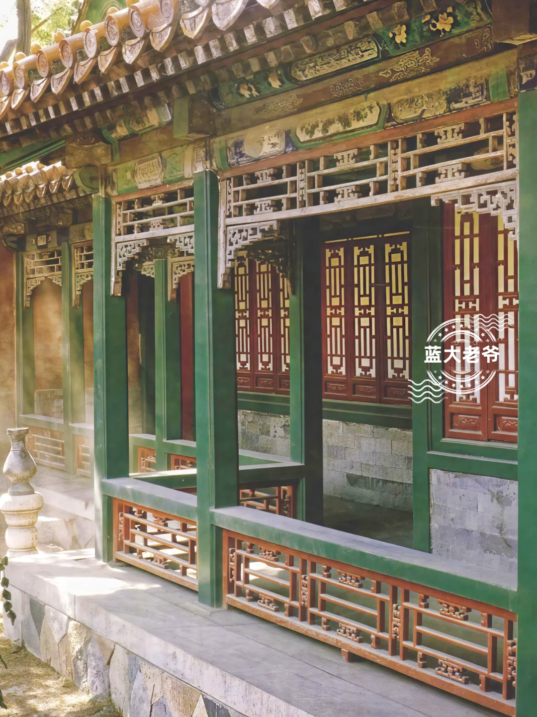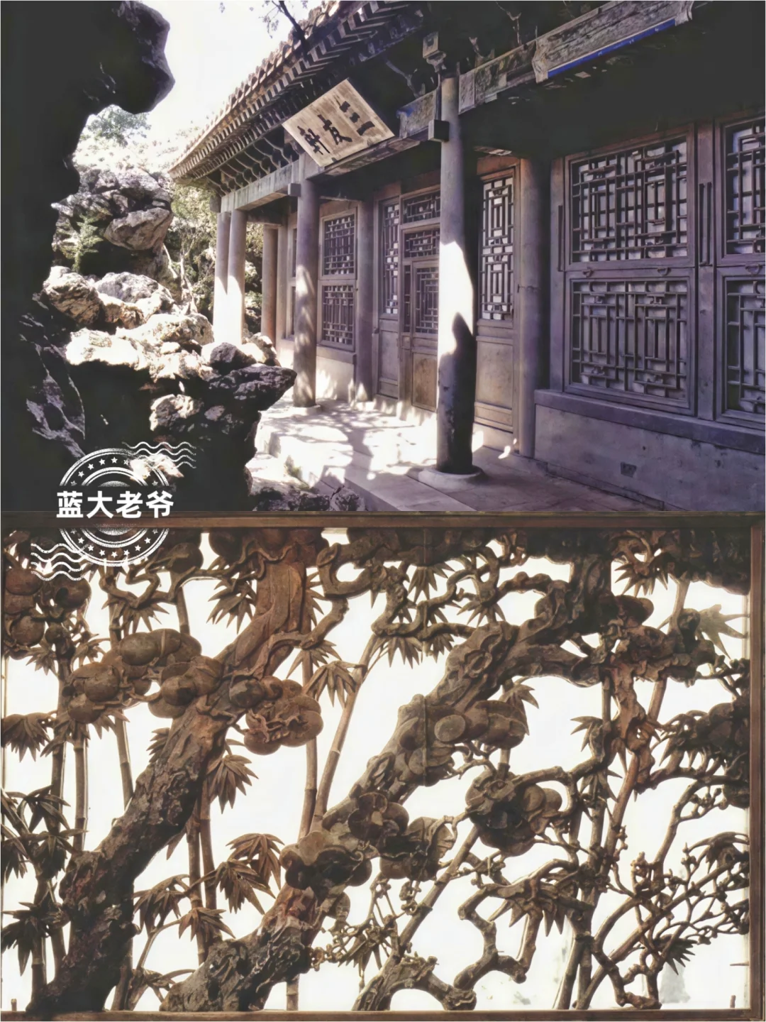 7️⃣三进东南角三友轩,三间北房,以高山作屏障可挡西北风,内设地炕,冬季游园之所。三友轩屋顶西面是歇山,东面以悬山顶同乐寿堂相接,宫中唯一,轩室内装修精致,松竹梅雕镂精细;三友轩紫檀松竹梅雕窗
