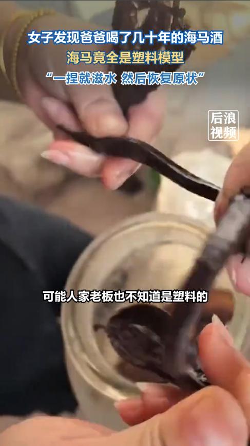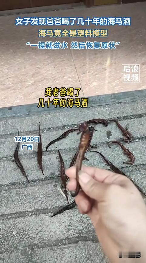 “离了个大谱!”12月20日,广西,一女子查看父亲的药酒时,越看越感觉里面的海马不是真的,于是就拿出来一个捏了捏,发现果然是塑料的!父亲喝了几十年都没有察觉,甚至觉得卖酒的也不知情。网友:这么多年到底补了什么? 民间一直有泡药酒的说法,用马蜂、毒蛇、中草药等来泡酒,说是喝了这样的酒能够延年益寿,这也成功引起了很多不明是非的人的关注,然而,骗局就是这么开始的。 前不久,女子在家闲着没事,就打量起被父亲视作珍宝的那瓶“药酒”,据父亲所说,这里面的海马已经泡了几十年的时间,自己这么多年来喝了不少,感觉身体变得异常强壮。 可是女子却觉得这种事都是假的,于是仔细观察起酒中的海马,她感觉这海马的模样和网上看到的不太一样,就偷偷捞了一个拿出来检查。 令女子没想到的是,这个海马非常的有弹性,一捏甚至还能出水!更过分的是,怎么拽都拽不断。 女子立即将事情告诉了父亲,父亲抱着最后一丝侥幸捏了下,意识到女儿没有说谎,自己这么多年的酒都白喝了!没想到竟然都是塑料模型。 网友看后表示,要是泡一两年没发现也就罢了,这泡了几十年都没发现就过分了,这么多年来就没发现味道不对吗,果然都是心理作用,只要相信它能补就能补! 信息来源:《塑料海马泡了几十年,老爷子还舍不得喝,你看这事弄的!》潮汐视频