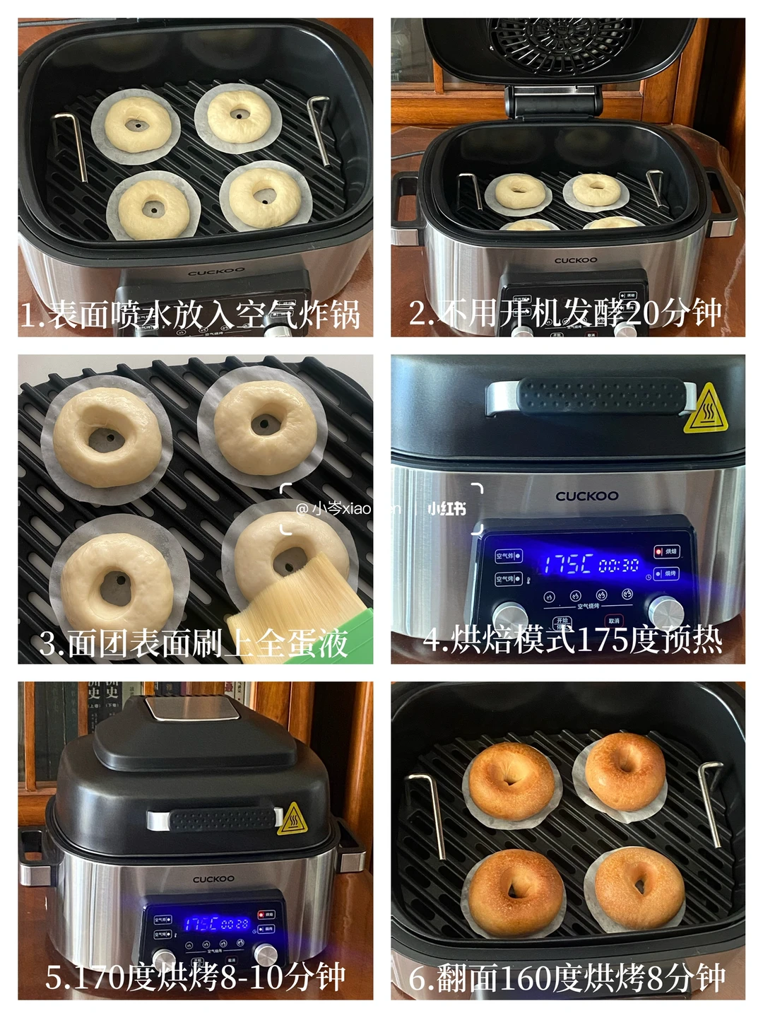 6.表面刷全蛋液,放入预热好的空气炸锅中,170度烘烤8-10分钟,上色满意后翻面,转160度烘烤8分钟左右。