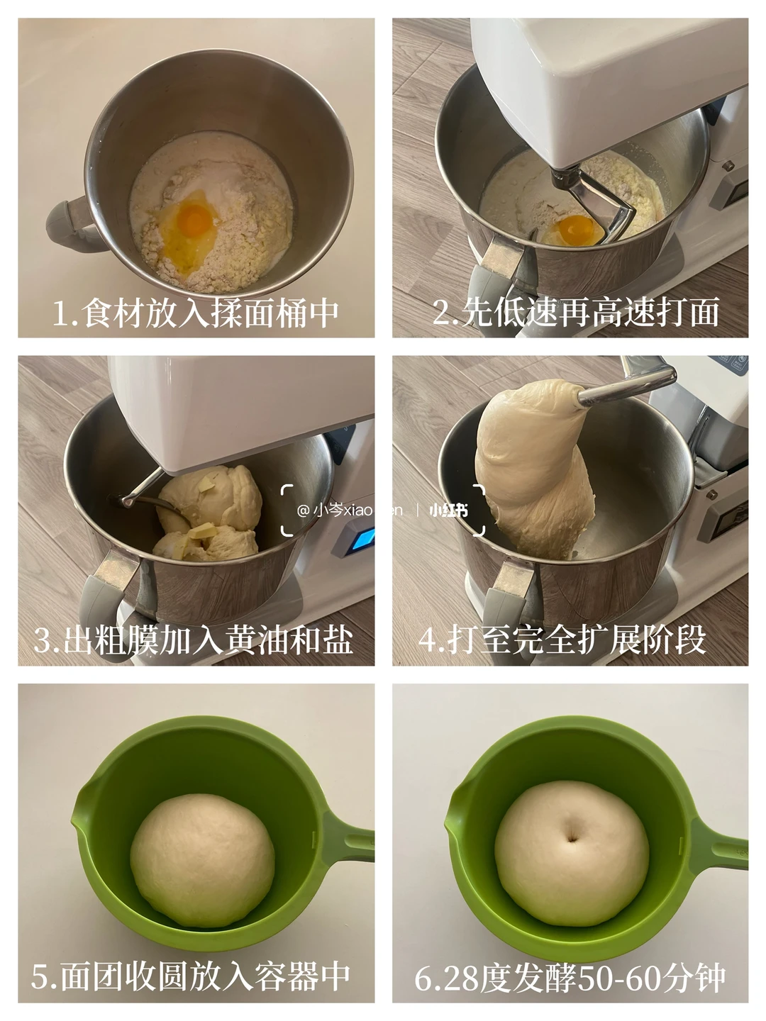 1.除盐和黄油外的食材放入厨师机揉面桶中,2档1分钟3档2分钟4档2分钟5档2分钟,揉出粗膜,加入黄油和盐,再揉一次,2档1分钟3档2分钟4档2分钟5档2分钟,可以拉出比较薄的手套膜即可。